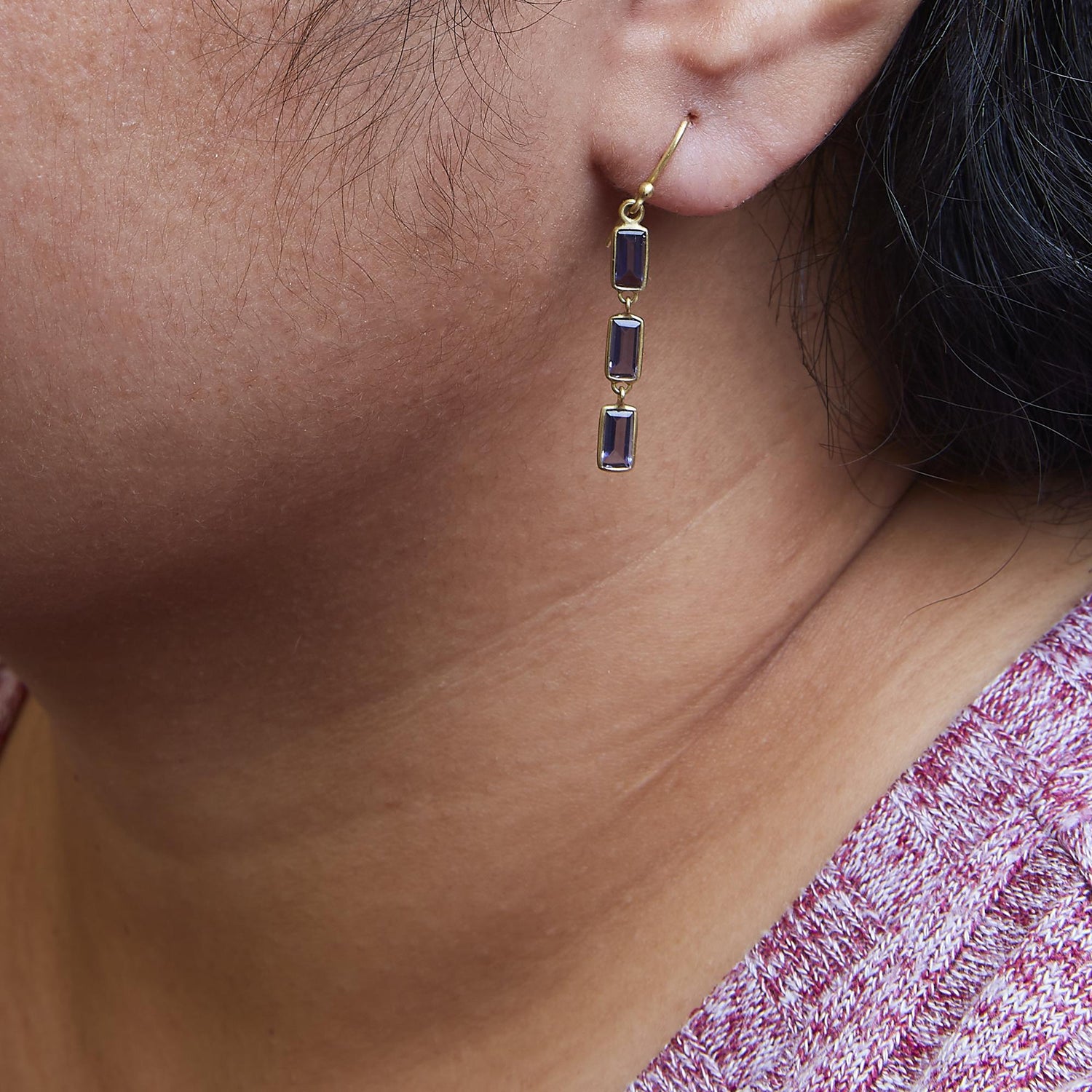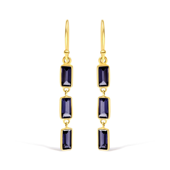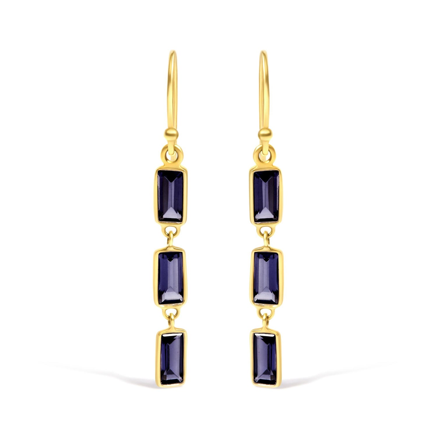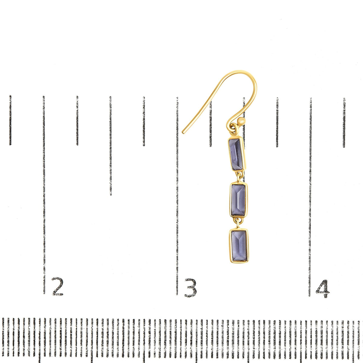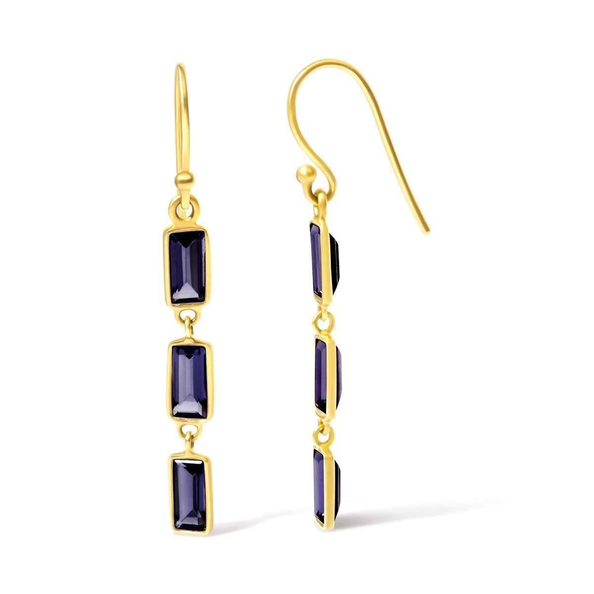 Crafted in 18K yellow gold with three 8x3mm baguette-cut purple iolite gemstones per earring. 1.5” drop. Bezel setting with fish hook closure.