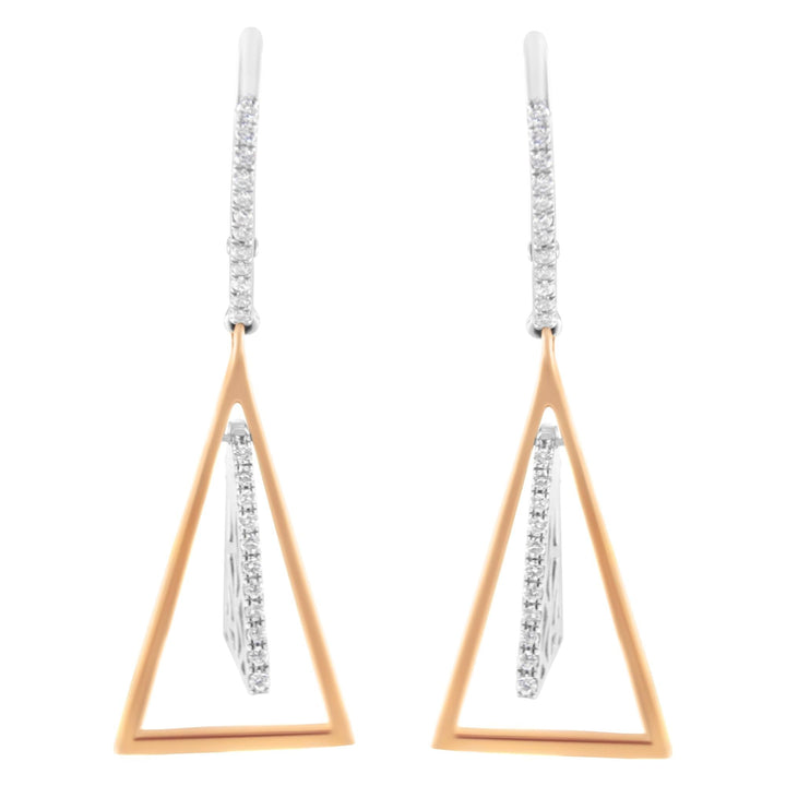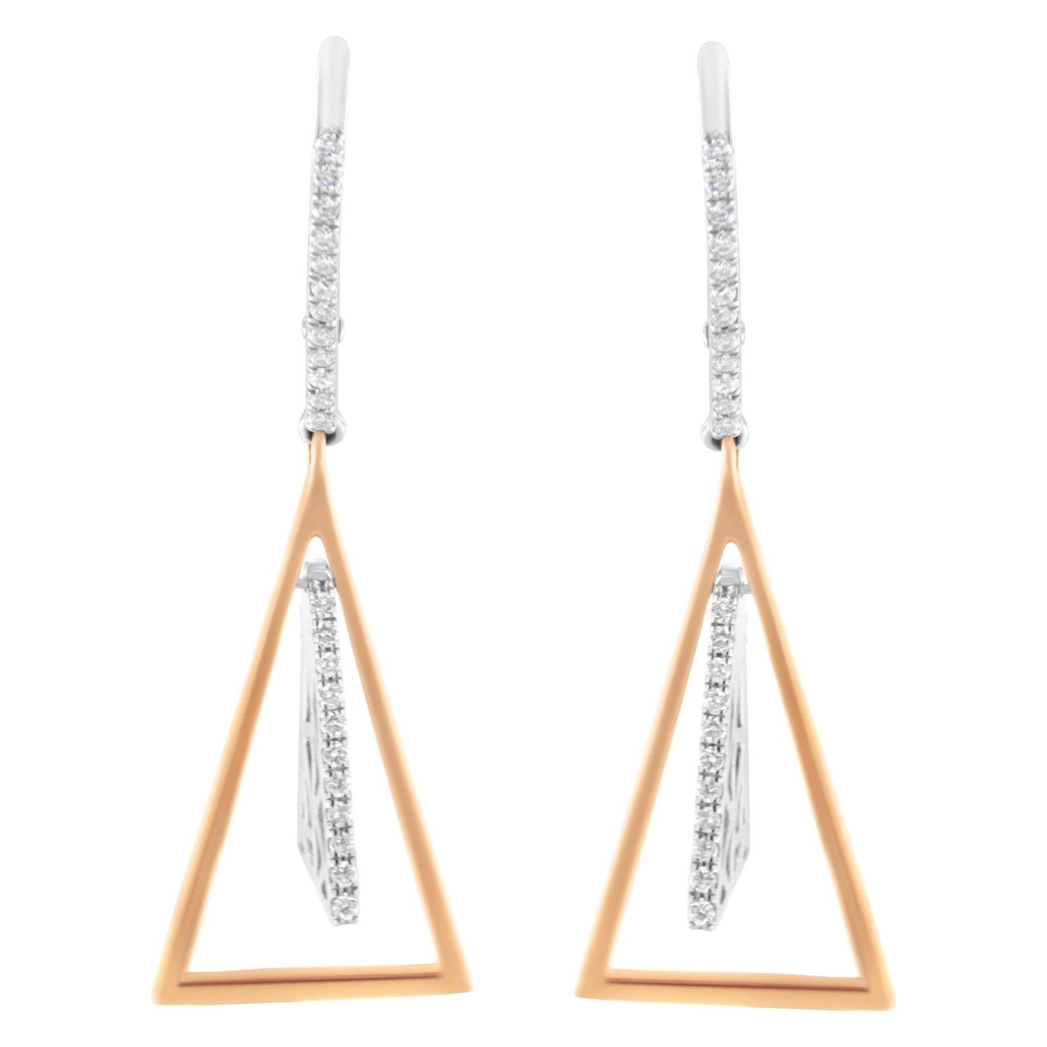 These 14K Rose and White Gold 3/8 Cttw Diamond Windchime Drop and Dangle Earrings by Haus of Brilliance are a melodic fusion of luxury and artistry. The earrings feature shimmering white gold elements encrusted with natural diamonds of G-H color and SI1-SI2 clarity, floating delicately inside a geometric rose gold triangle. The approximately 3/8 carat total weight diamonds provide scintillating radiance, their brilliance amplified by white rhodium plating. These earrings, measuring 1.6 inches in length, dangle gracefully with every movement, making them an enchanting statement piece for those who value sophistication and unique artistry.
