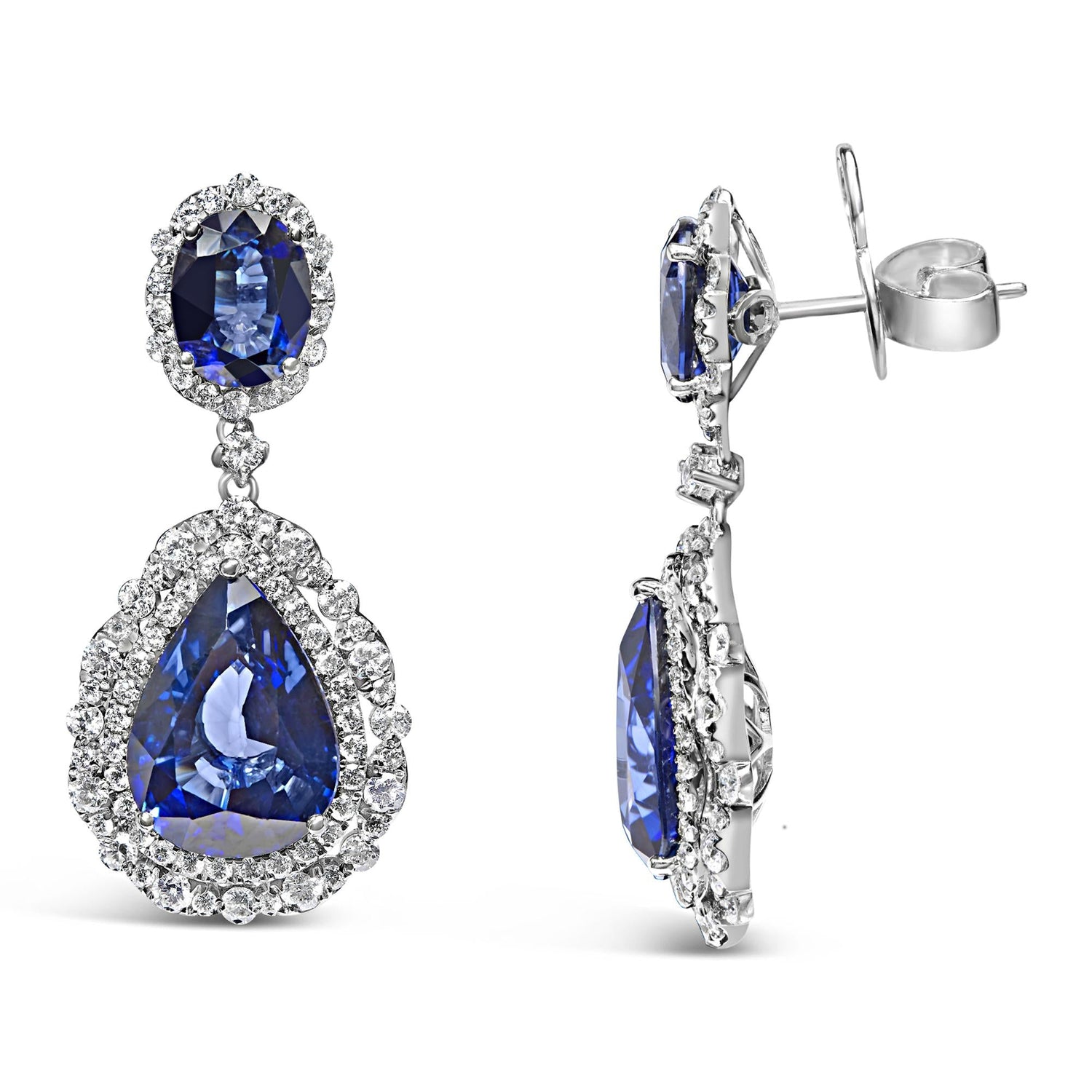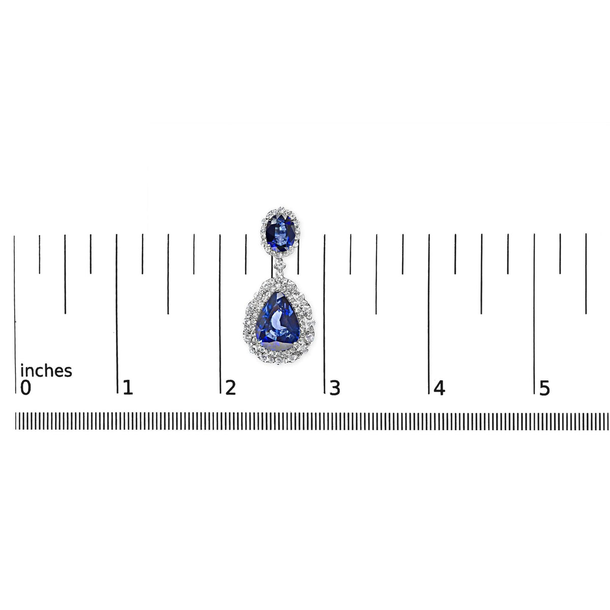 Crafted in 18K white gold, with 2 3/4 Cttw of diamonds (G-H color, SI1-SI2 clarity) and pear-shaped blue sapphires (15x11mm and 11x9mm). Post and butterfly backings.