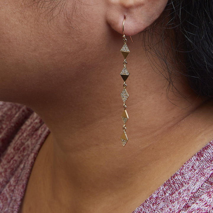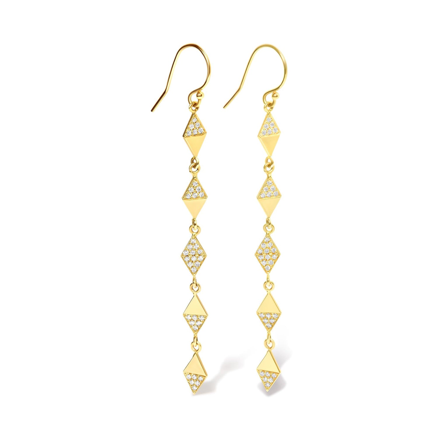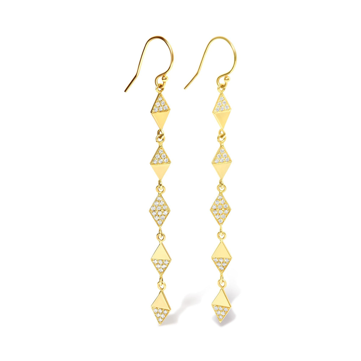 These 14K Yellow Gold 1/3 Cttw Diamond Studded Kite Drop and Dangle Earrings by Haus of Brilliance are an elegant and sophisticated choice for any occasion. Adorned with 72 round diamonds, totaling 1/3 carat, the diamonds are set in pave settings that enhance their brilliance. The kite-shaped drop design adds a unique touch, while the 14K yellow gold ensures a warm, luxurious finish. These earrings are secured with hook findings, offering both style and comfort for the wearer.
