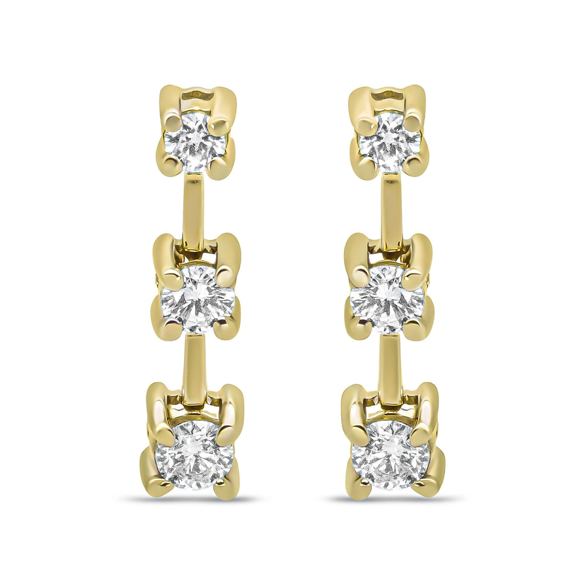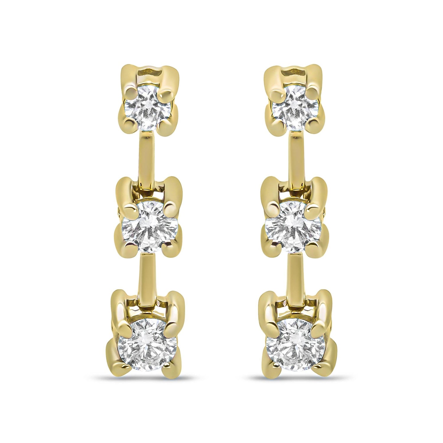 Crafted in 14K yellow gold. Set with 1/2 cttw round natural diamonds (H-I color, SI1-SI2 clarity). Drop measures approximately 0.6 inches. Secured with screw backs.
