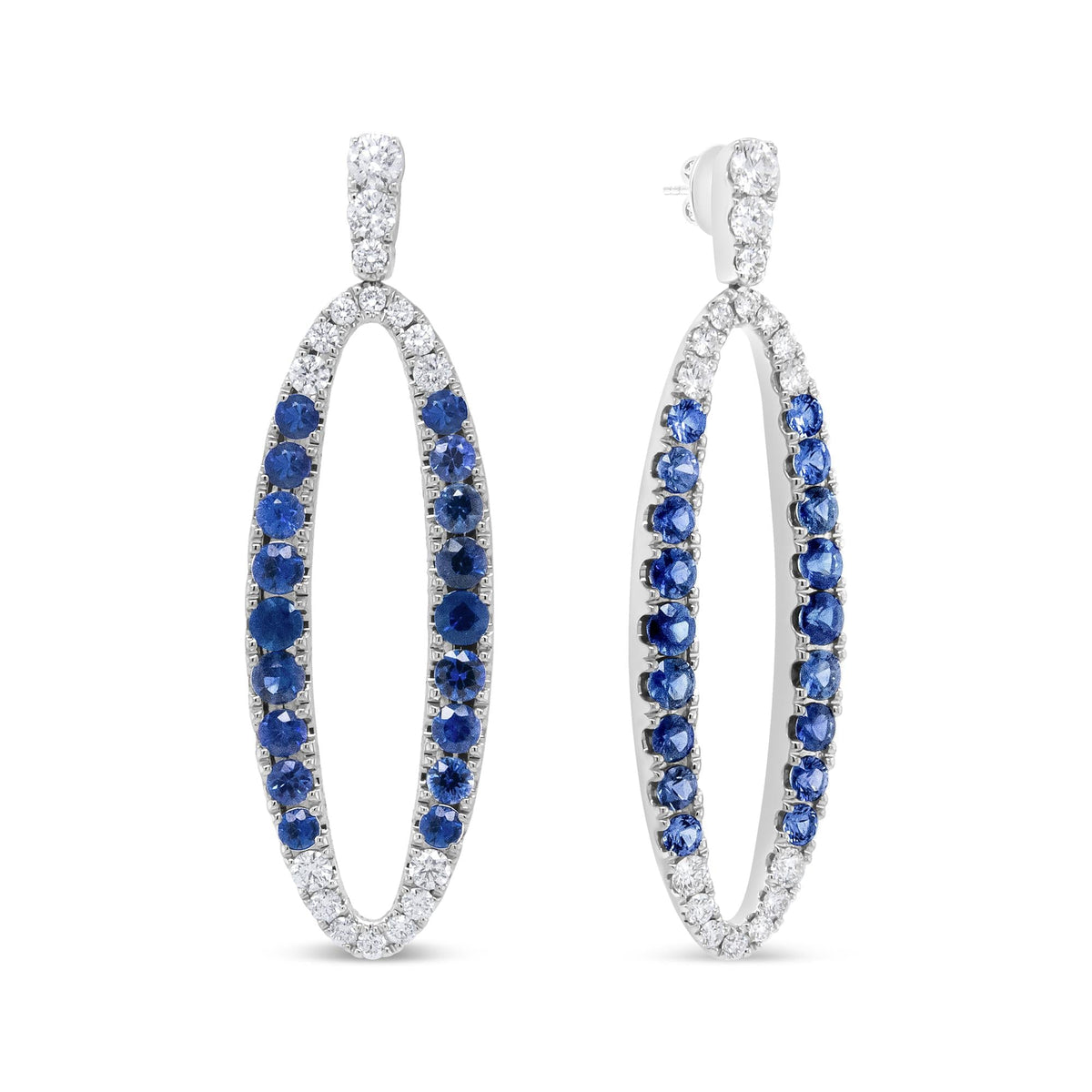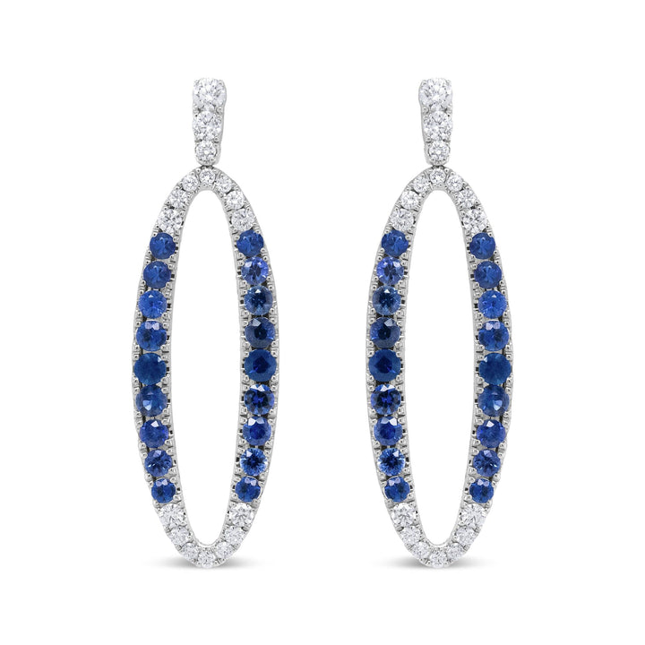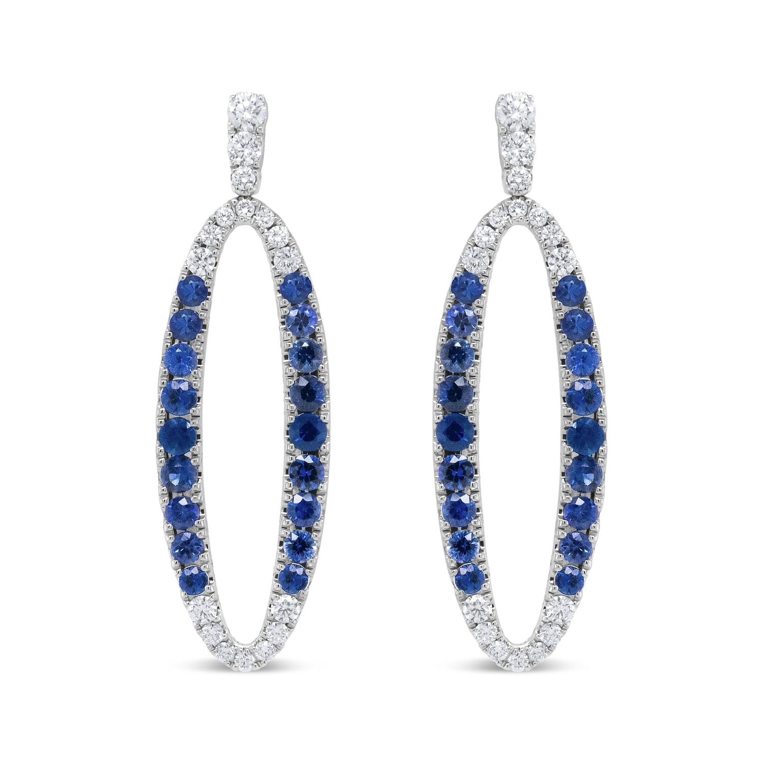 These 18K White Gold 1.11 Cttw Blue Round Diamond and Blue Sapphire Openwork Oval Shaped Dangle Earrings by Haus of Brilliance combine diamonds and sapphires in a stunning graduated design, creating a chic, contemporary vibe.