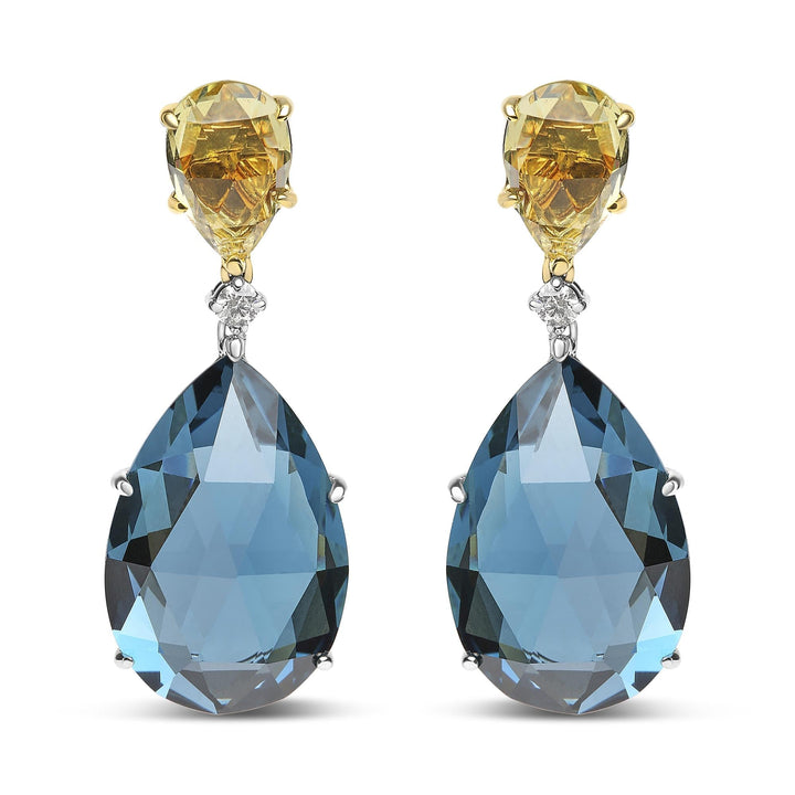 These 18K White and Yellow Gold 1/5 Cttw Diamond with Pear Cut Lemon Quartz and Pear Cut London Blue Topaz Gemstone Dangle Earrings by Haus of Brilliance showcase an elegant combination of diamonds and gemstones.