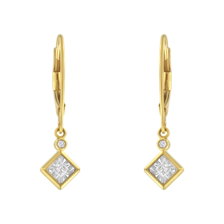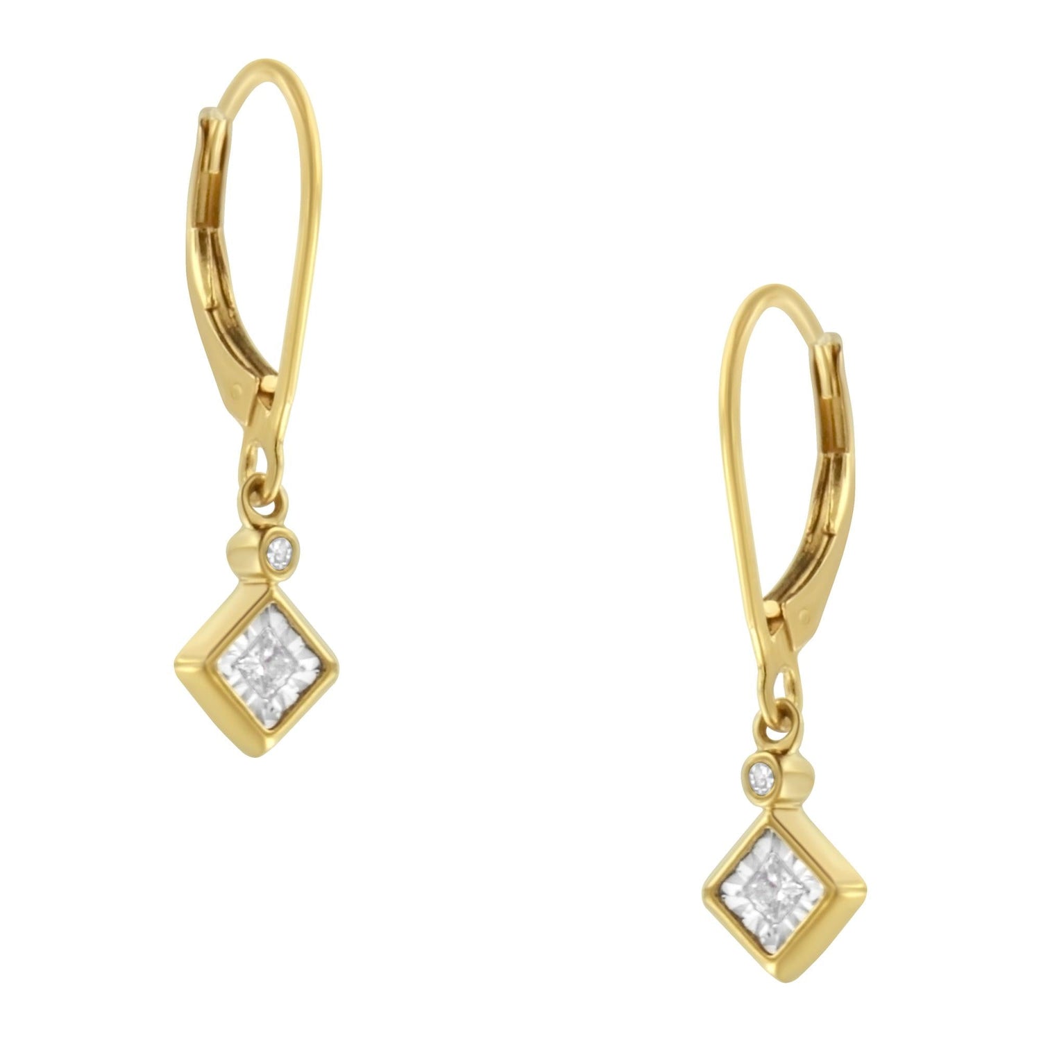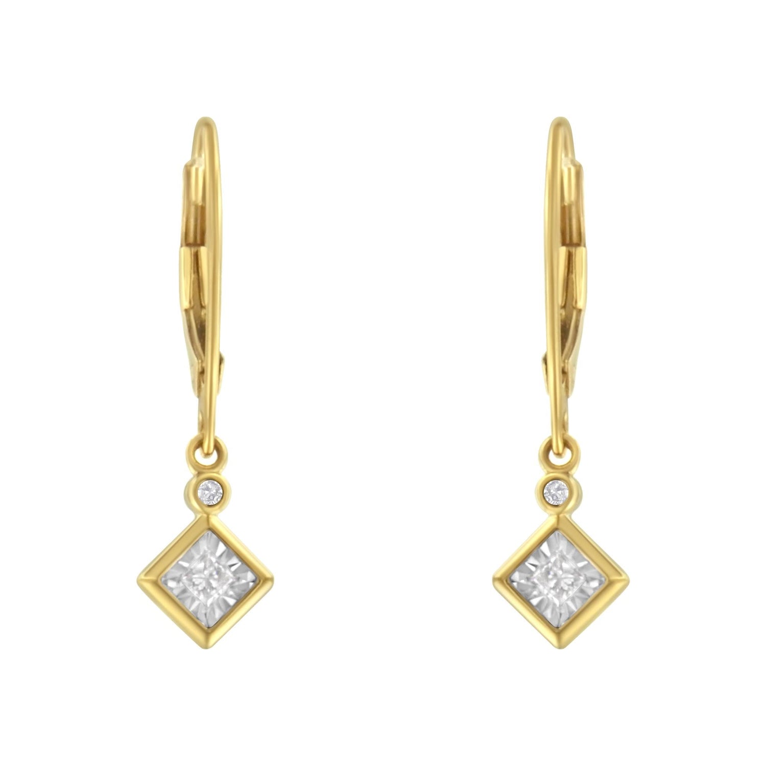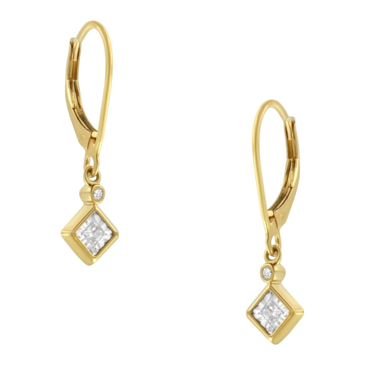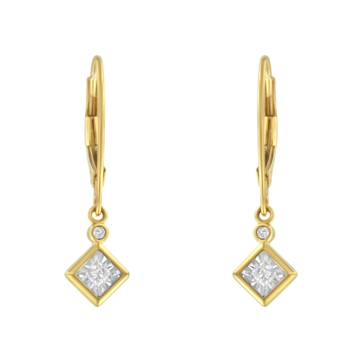 These 2 Micron 14K Yellow Gold Plating Diamond Dangle Earrings by Haus of Brilliance offer a delicate and elegant design, perfect for adding a touch of sparkle to your everyday look. The combination of bezel-set round diamonds atop miracle-set princess-cut diamonds creates a sophisticated look. With their charming dangle from a lever-back hook, these earrings exude grace and effortless elegance.