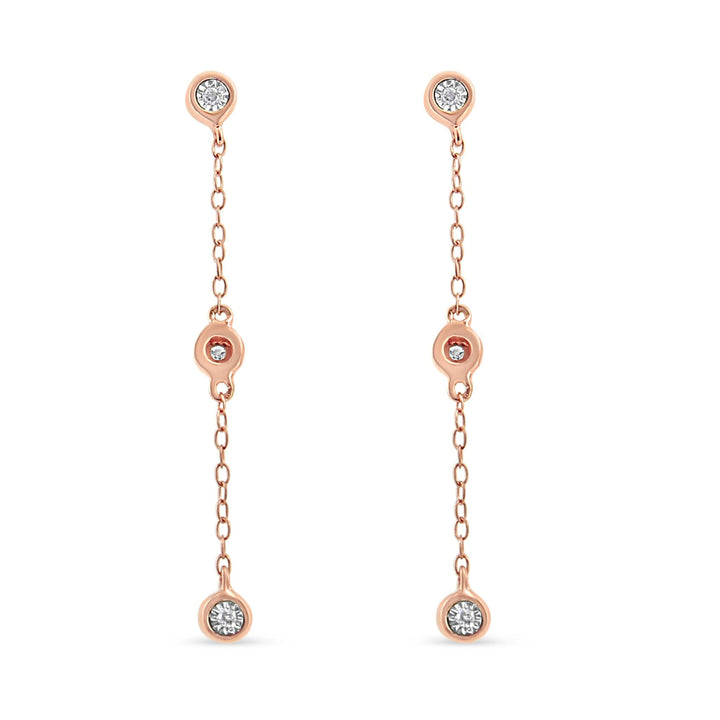 These 10K Rose Gold Plated .925 Sterling Silver 1/15 Cttw Diamond Dangle Earrings by Haus of Brilliance deliver delicate shimmer and effortless charm. Featuring a trio of round-cut diamonds cascading down each earring, this refined style enhances both everyday looks and special ensembles with a gentle glisten. The feminine rose gold plating adds warmth and romance to their petite silhouette.