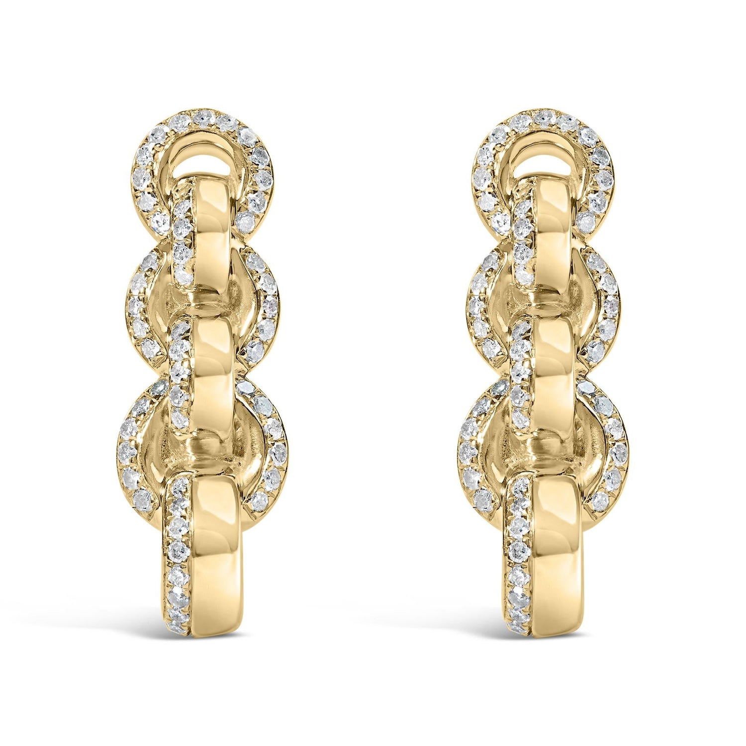 These 14K Yellow Gold Plated .925 Sterling Silver 3/4 Cttw Diamond Chain Link Drop Earrings by Haus of Brilliance feature a trio of interlocked chain links adorned with natural diamonds. With a total weight of 3/4 carat, these earrings are designed with H-I color and I1-I2 clarity diamonds, ensuring a radiant glow. The earrings dangle gracefully at 3/4 inches from the earlobes and are secured with a push-back mechanism, providing comfort and safety for daily wear or special occasions.