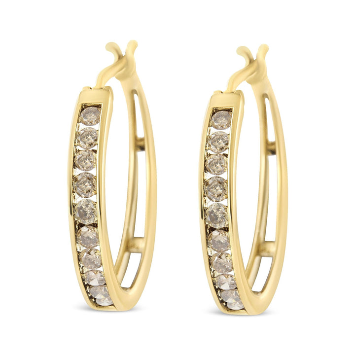 14K Yellow Gold Plated .925 Sterling Silver 1.0 Cttw Channel Set Champagne Diamond Hoop Earrings with Snap Post (K-L Color, I1-I2 Clarity)