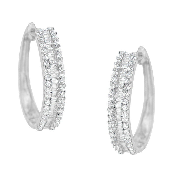 These 10K White Gold Diamond Hoop Earrings by Haus of Brilliance are timeless and elegant, featuring 0.75 carats of round and baguette diamonds. Set with baguettes down the center and rounds on the outer edges, these earrings radiate a subtle sparkle. Graded I-J in color and I2-I3 in clarity, the diamonds add classic sophistication, while the locking clip style posts ensure a secure and comfortable fit. Perfect for any occasion, these versatile earrings are a must-have in every jewelry collection.