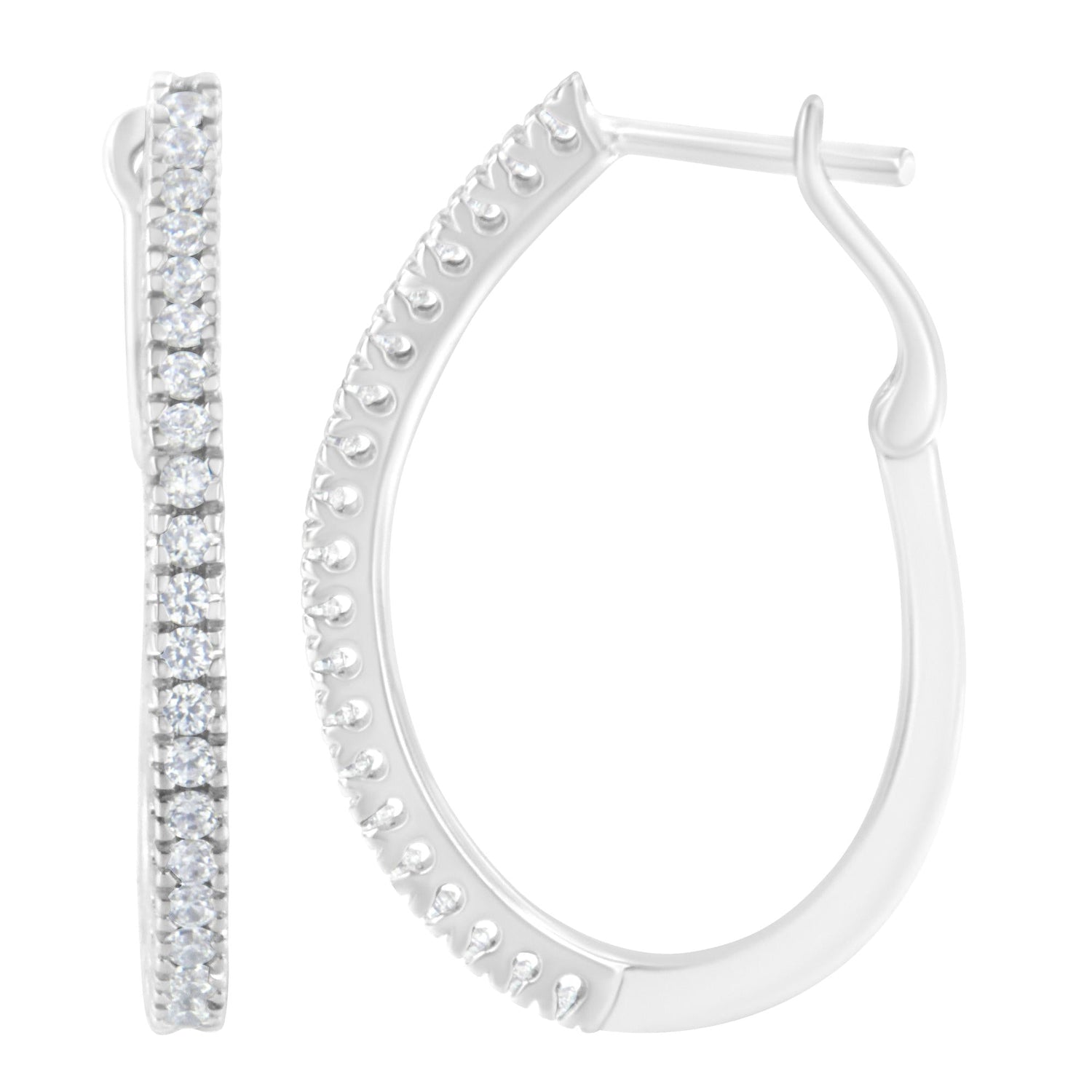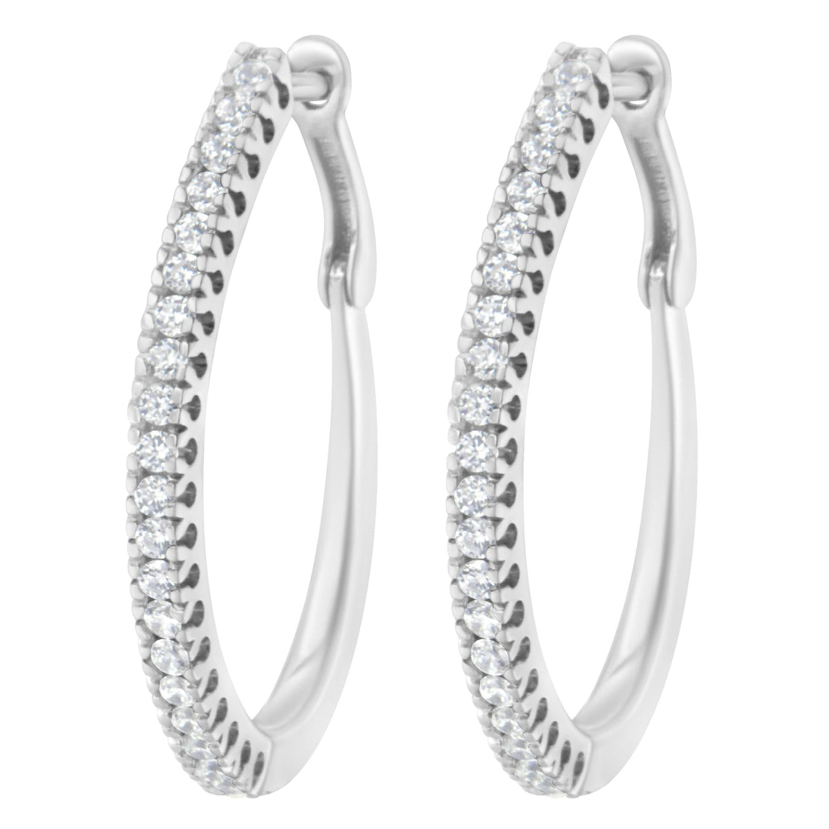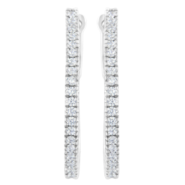 These 10KT White Gold 1/2 CTTW Diamond Hoop Earrings by Haus of Brilliance are glamorous hoop earrings featuring round-cut diamonds prong-set halfway around the hoops. Crafted in 10K white gold, these earrings make an elegant and sparkling gift for someone special, with a total diamond weight of 1/2 carat.