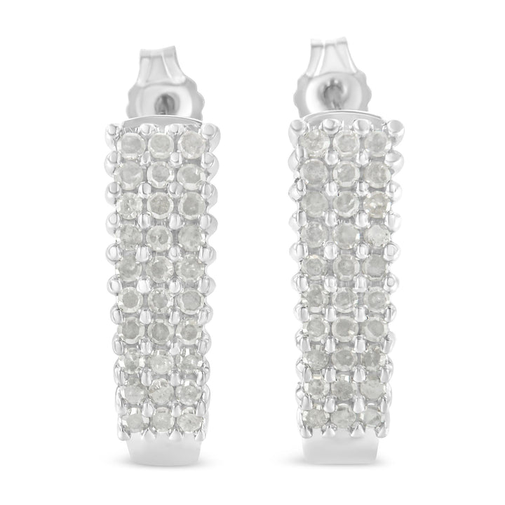 Crafted in sterling silver with 1ct total weight of rose-cut diamonds (I-J Color, I2-I3 Clarity), featuring a J-shape hoop design with a push-back mechanism.