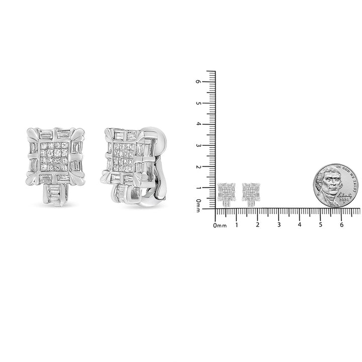 14K White Gold 1.0 Cttw Princess and Baguette-Cut Diamond Square Framed Huggie Hoop Omega Earrings (H-I Color, SI1-SI2 Clarity)