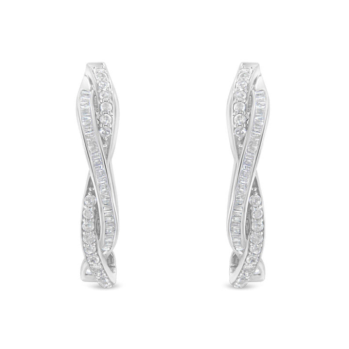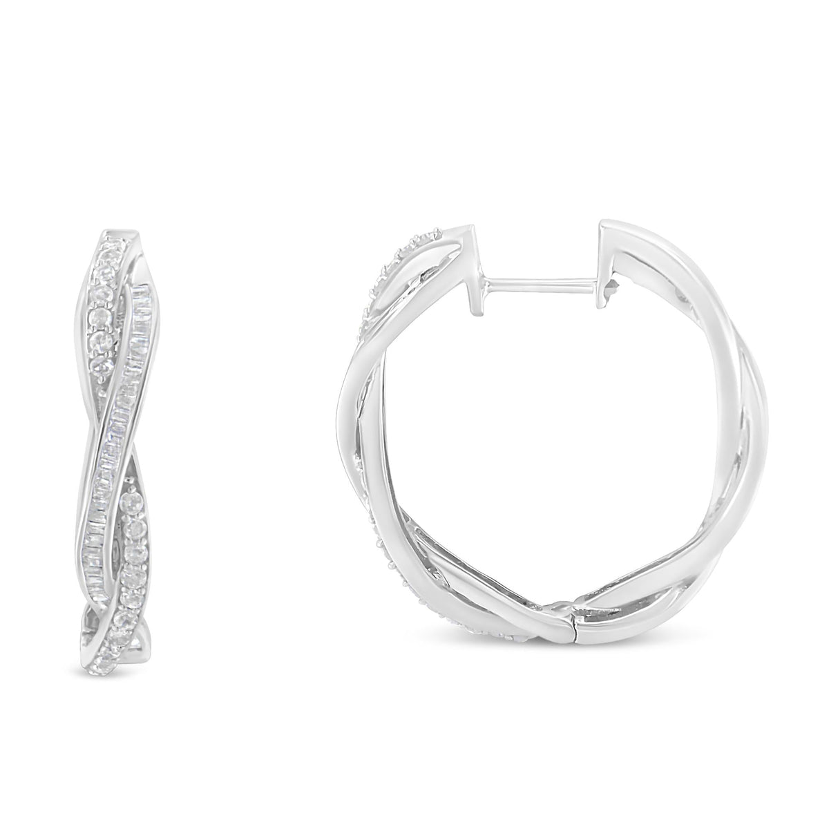 These Sterling-Silver Diamond Hoop Earrings by Haus of Brilliance are designed to dazzle with 36 round-cut diamonds in a pave setting and 64 baguette-cut diamonds in a channel setting. These earrings have a total diamond weight of 0.75 cttw, making them the perfect choice for adding sparkle to a special night out. The earrings are secured with lever backs for a comfortable fit.