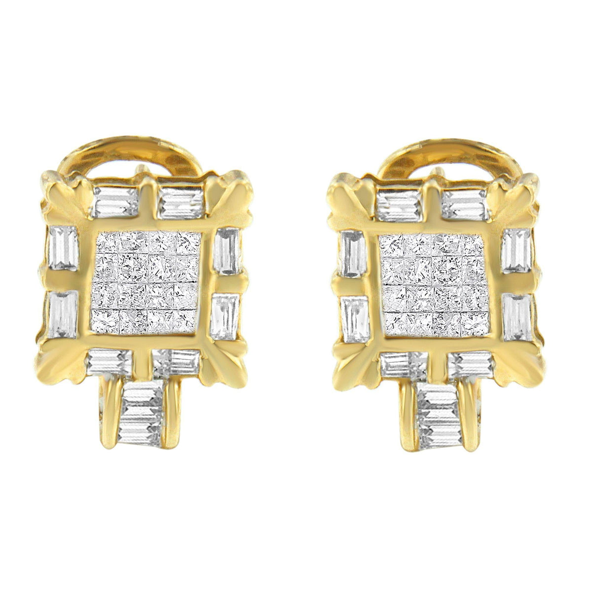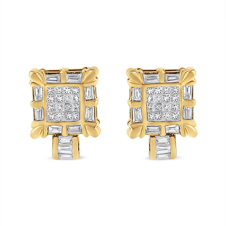 14K Yellow Gold 7/8 Cttw Princess and Baguette-Cut Diamond Square Framed Huggie Hoop Omega Earrings (H-I Color, SI1-SI2 Clarity)