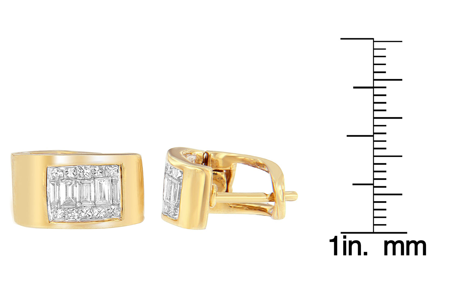 These 14K Yellow Gold 1/2 cttw Diamond Huggy Earrings by Haus of Brilliance offer a sleek and glamorous look with their intricate combination of princess and baguette cut diamonds. Designed to dazzle, these earrings bring together the luxurious finish of 14K yellow gold with radiant diamonds, creating a truly timeless piece. Ideal for both casual and formal occasions.