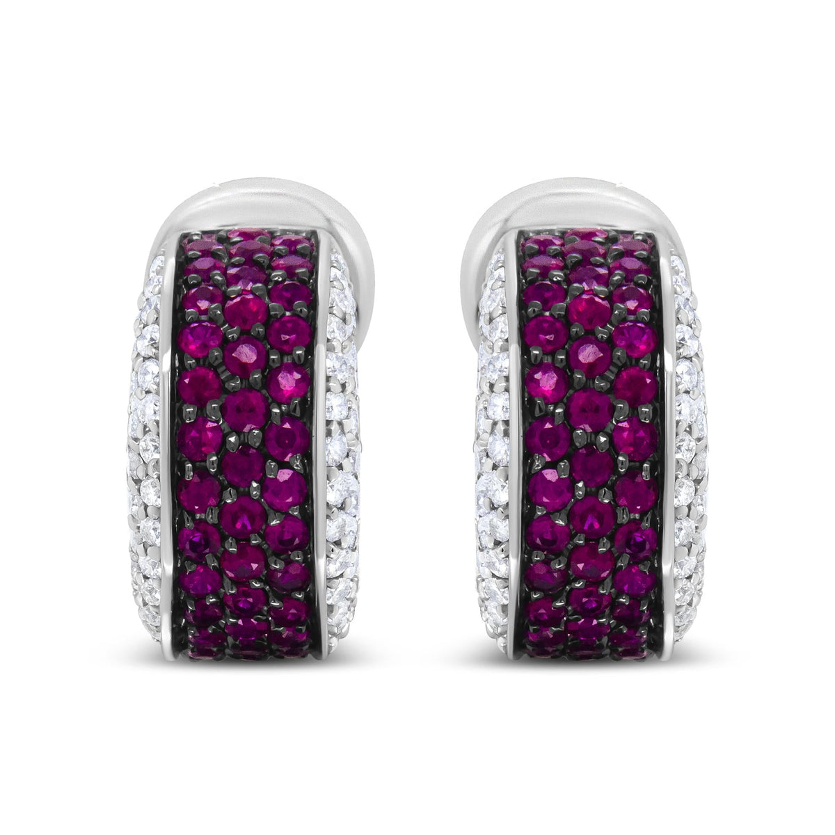 These 18K White Gold and Black Rhodium Plated 3/4 Cttw Round Diamonds and 1mm Round Red Ruby Huggie Hoop Earrings by Haus of Brilliance are bold and stylish. The combination of diamonds and red rubies set in black rhodium-plated white gold gives these earrings a unique, elegant look.