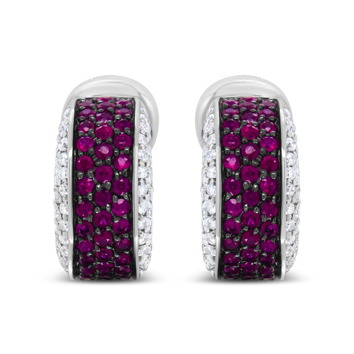 18K White Gold and Black Rhodium Plated 3/4 Cttw Round Diamonds and 1mm Round Red Ruby Huggie Hoop Earrings (F-G Color, VS1-VS2 Clarity)