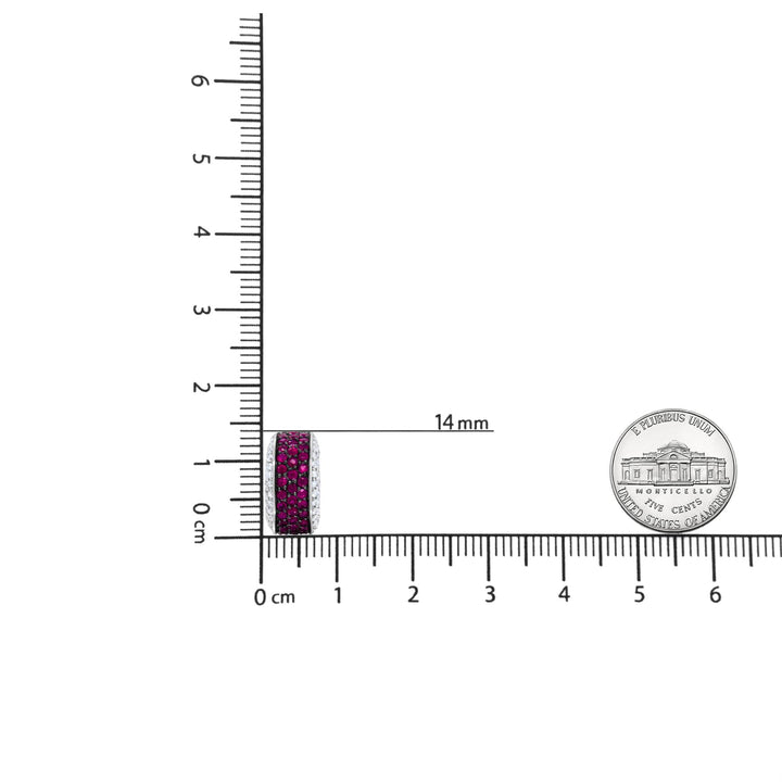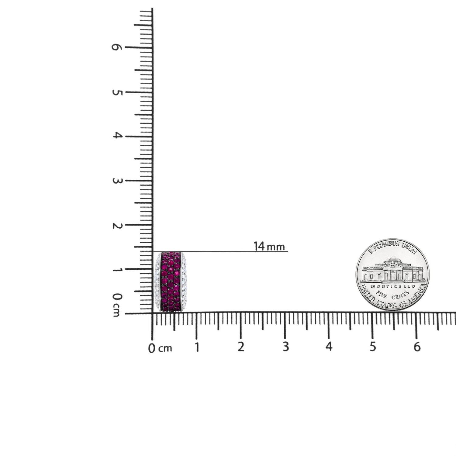 18K white gold, 3/4 Cttw round diamonds, 1mm round red rubies, F-G color, VS1-VS2 clarity. Omega findings.