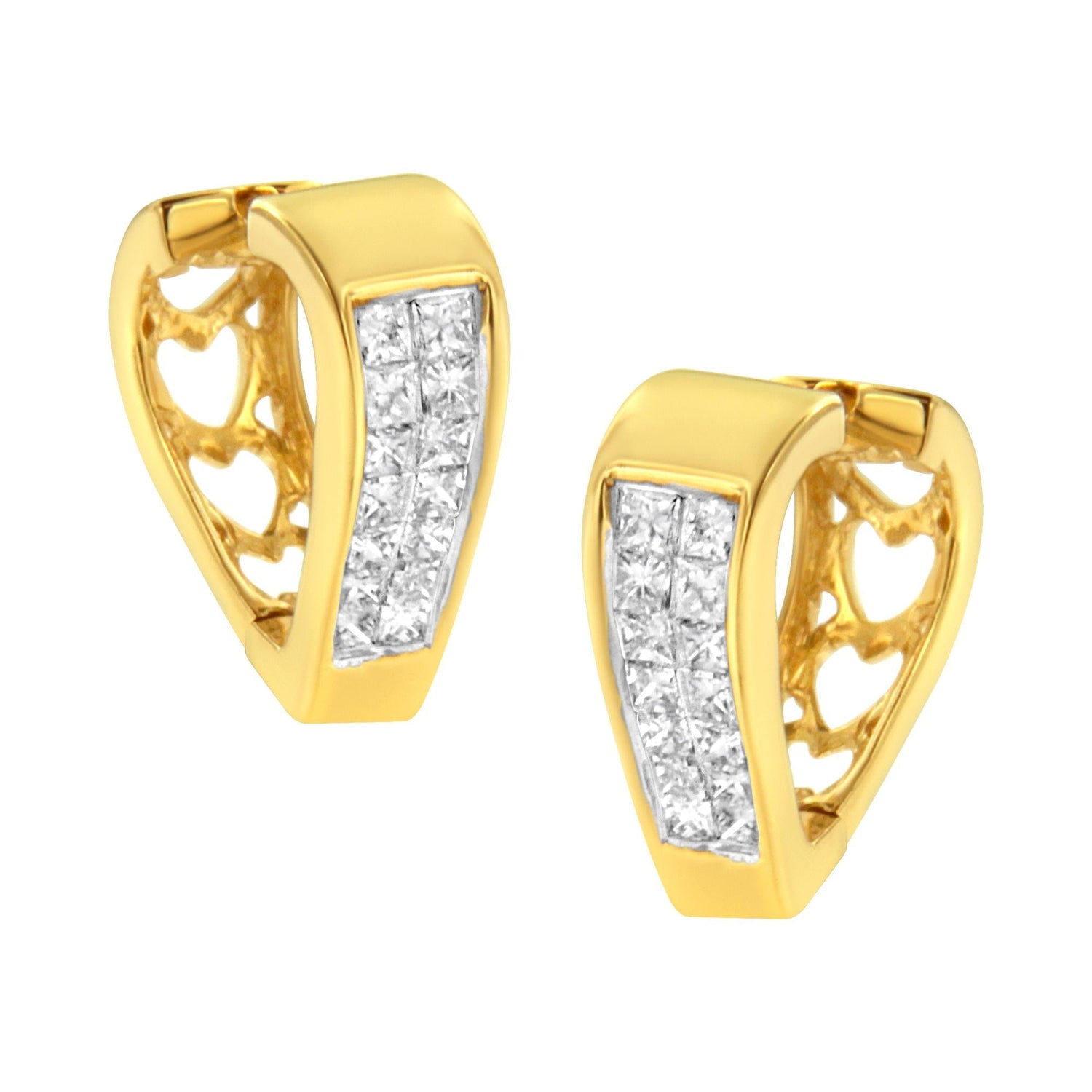 These 14K Yellow Gold Diamond Huggy Earrings by Haus of Brilliance are petite and trendy, featuring heart-shaped designs etched into the base. The earrings showcase stunning princess-cut diamonds in an invisible setting, with a total diamond weight of 1/2 carat. These make the perfect gift for any loved one.