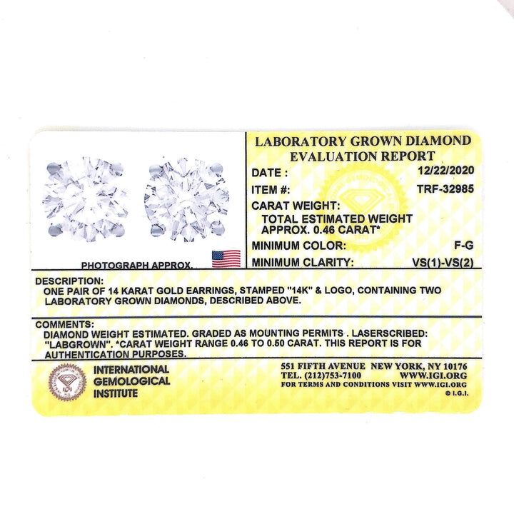 IGI Certified 14K White Gold 1/2 Cttw Lab Grown 4-Prong Round-Cut Diamond Classic Solitaire Stud Earrings (F-G Color, VS1-VS2 Clarity)
