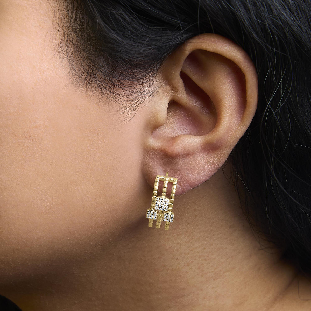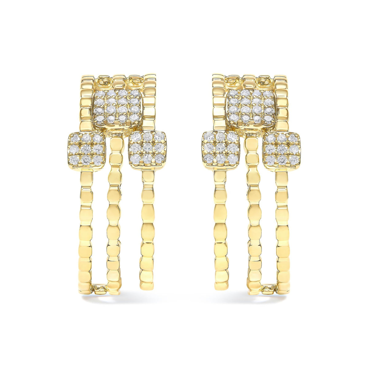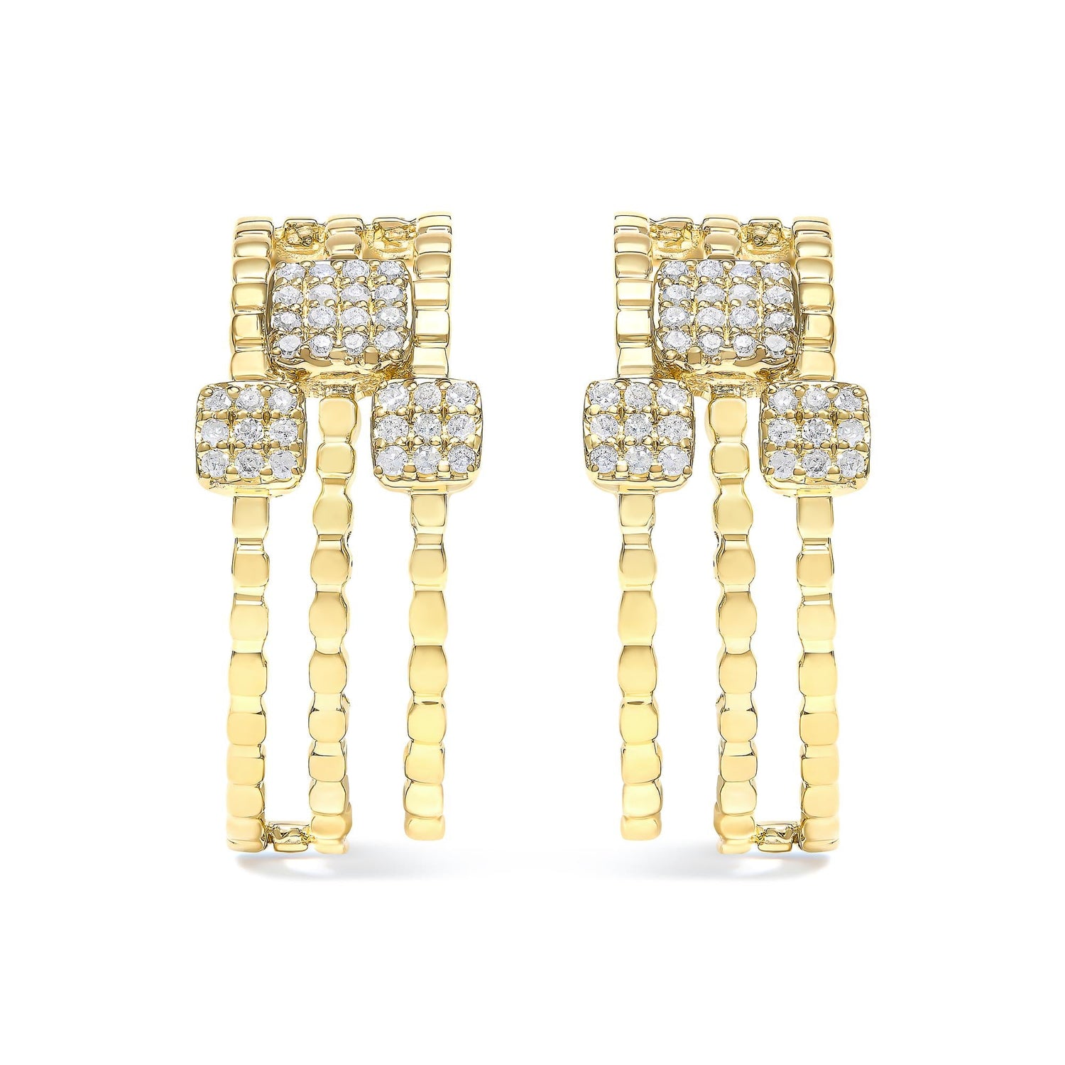 These Diamond Dangle Stud Earrings by Haus of Brilliance are a dynamic interpretation of linear luxury. Their interlocking multi-dimensional links flow with movement, each enhanced by a diamond-set square accent. The rich gold plating over sterling silver warms the look, while the diamonds bring crisp sparkle—perfect for elevating any ensemble with elegant flair.