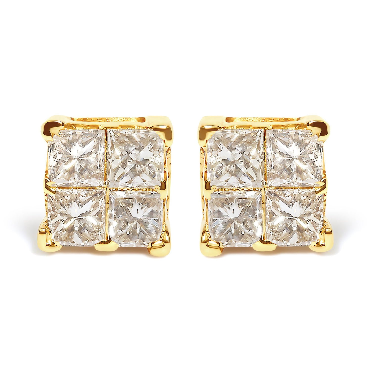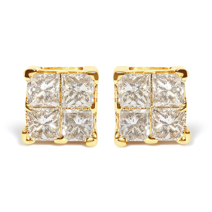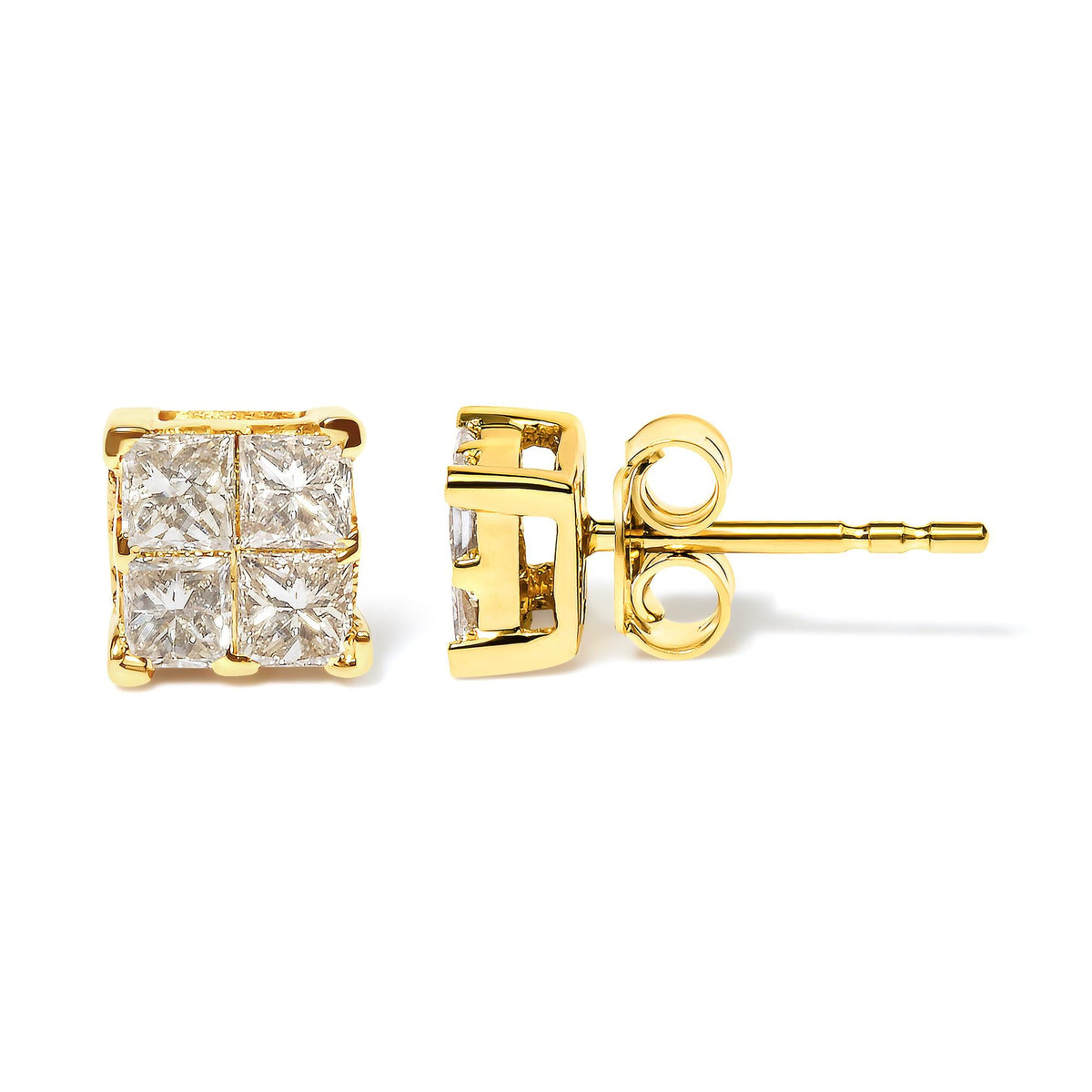 14K Yellow Gold 3/4 Cttw Invisible Set Princess-Cut Diamond 4 Stone Square Stud Earrings (J-K Color, SI2-I1 Clarity)