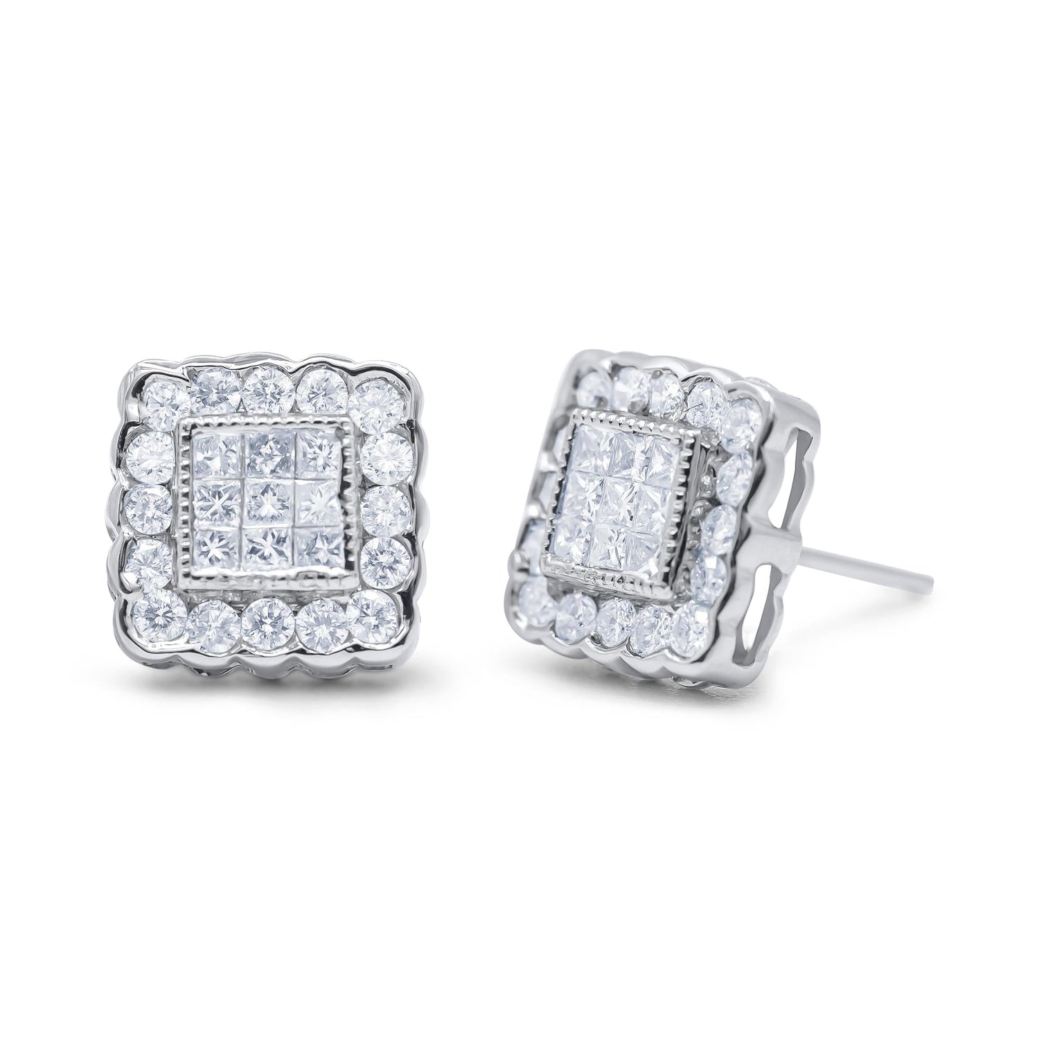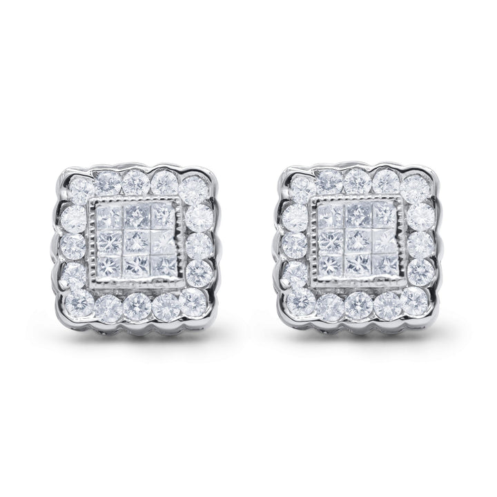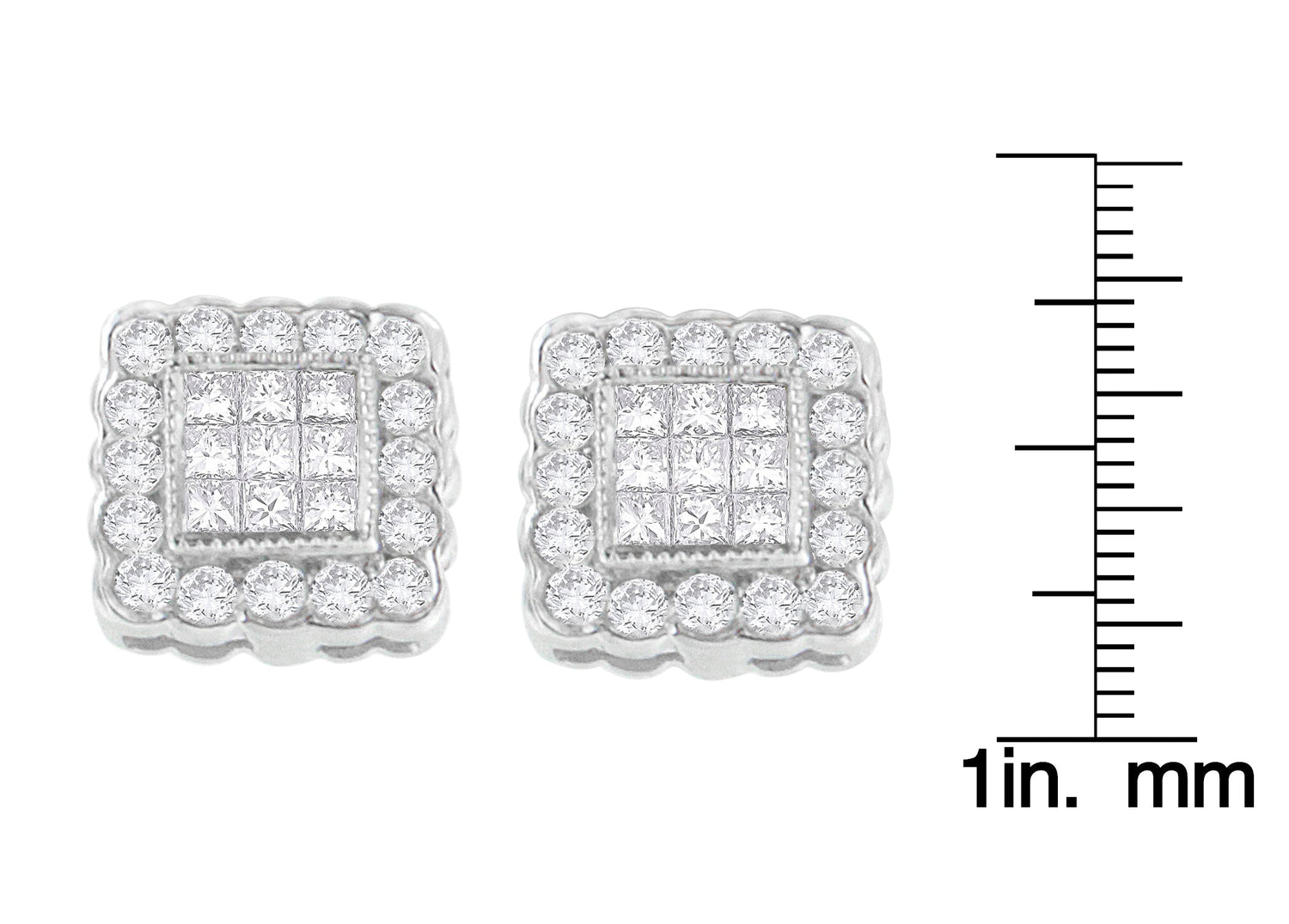 14K White Gold 1.0 Cttw Round Brilliant & Princess Cut Diamond Scallop-Edge Framed Square Halo Stud Earrings (G-H Color, SI1-SI2 Clarity)
