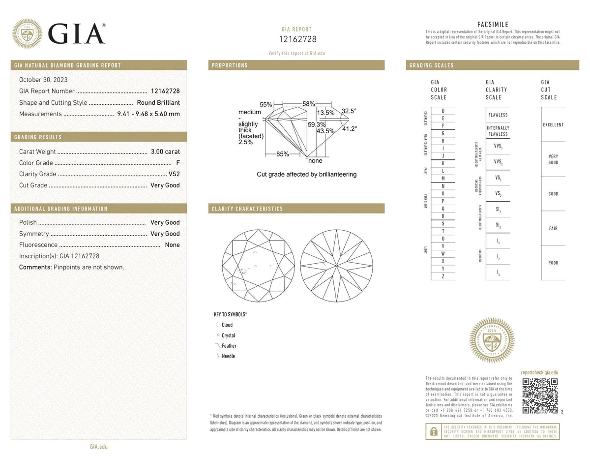 These GIA Certified 14K White Gold 6.0 Cttw 4-Prong Round Brilliant Cut Diamond Solitaire Stud Earrings by Haus of Brilliance are the embodiment of refined luxury. Each earring features a 3.00 carat GIA-certified round brilliant diamond, celebrated for its F color and VS2 clarity—hallmarks of extraordinary quality. The diamonds' very good cut, polish, and symmetry optimize brilliance, enhancing their natural fire and scintillation. Nestled in classic 4-prong settings and secured with screw backs, these earrings offer a harmonious balance of elegance and practicality. A celebration of purity and craftsmanship, this pair reflects sophistication and prestige, making them an exceptional choice for life’s grandest moments.