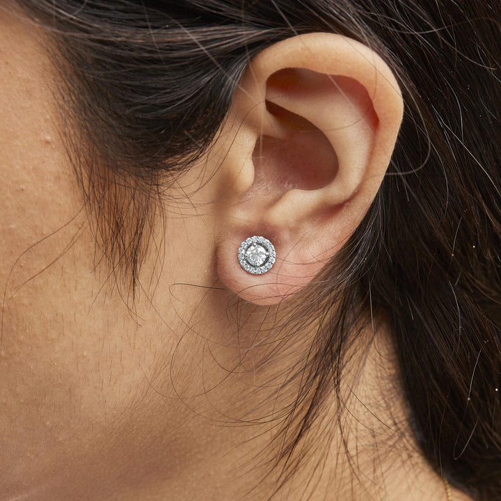 These Lab-Grown Diamond Halo Earrings by Haus of Brilliance offer a contemporary take on timeless glamour. Each 14K white gold stud centers on a round lab-grown diamond, encircled by a luminous halo of 32 accent stones. With 3/4 carat total weight and 34 diamonds in total, these earrings sparkle with ethical brilliance and unmatched grace. The push-back settings complete their flawless wearability.