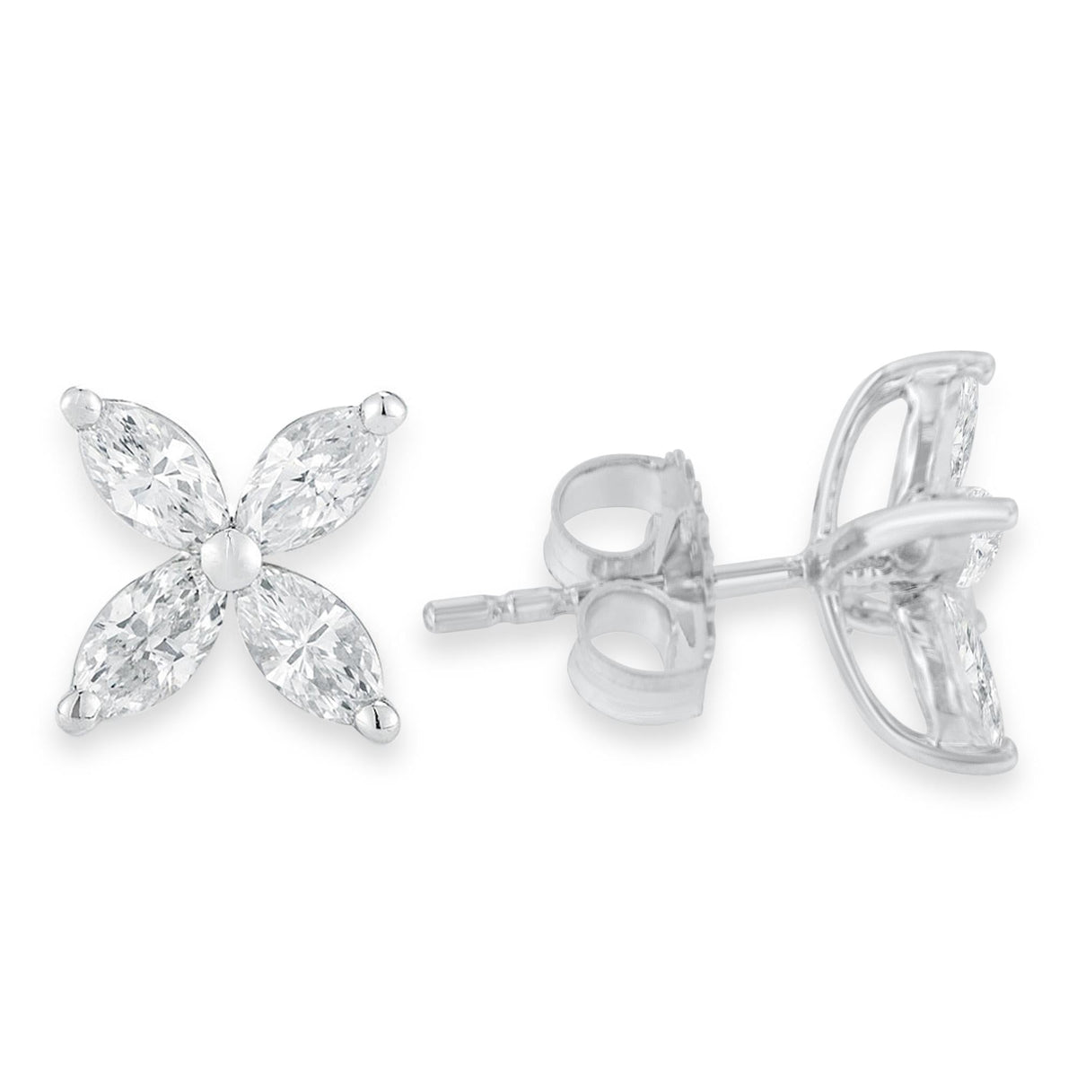 These 14K White Gold 1.0 Cttw Lab Grown Marquise Diamond 8 Stone Floral Leaf Stud Earrings by Haus of Brilliance are a timeless design with 8 lab-grown marquise diamonds set in a floral arrangement. Crafted in 14K white gold, these earrings add a touch of elegance and sparkle to any look.
