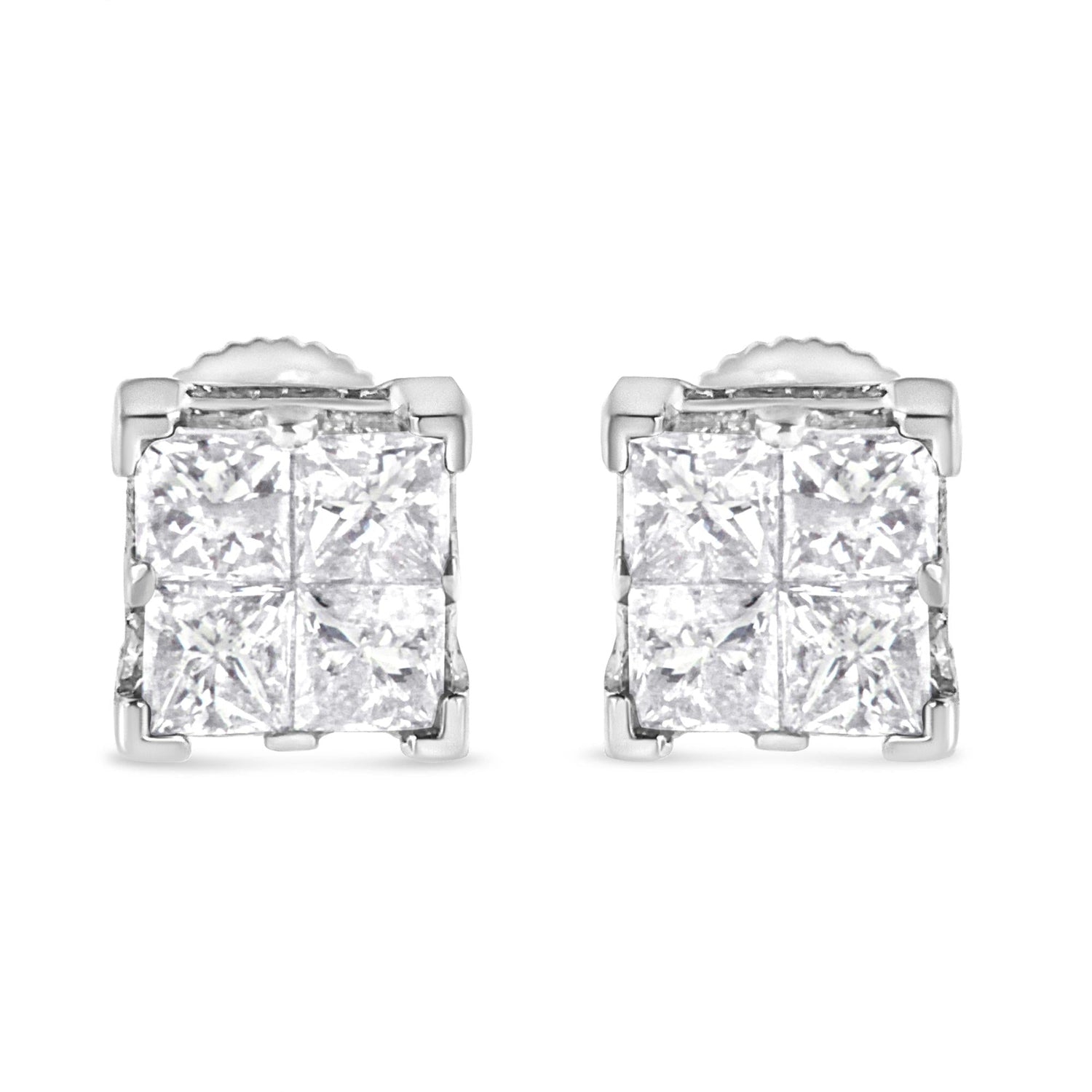 These 10K White Gold 3/4 Cttw Invisible Set Princess-Cut Diamond Composite Square Stud Earrings by Haus of Brilliance offer a modern yet timeless design. Set in 10K white gold, each earring features 4 princess-cut diamonds arranged in an invisible setting to create the illusion of a larger diamond. These earrings offer sophistication and elegance.