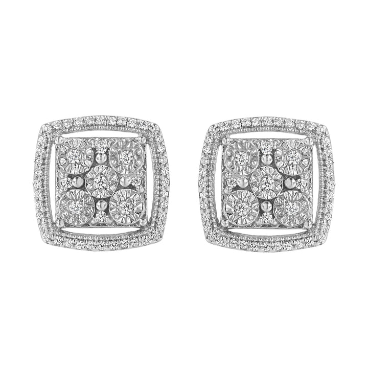 These .925 Sterling Silver 3/8 Cttw Miracle Set Round Diamond Double Halo Cluster Earrings by Haus of Brilliance feature 3/8ct of diamonds arranged in a square cluster with a double halo of sparkling round-cut diamonds. Set in cool sterling silver, these earrings offer a dazzling display of light and are perfect for adding elegance to your look.