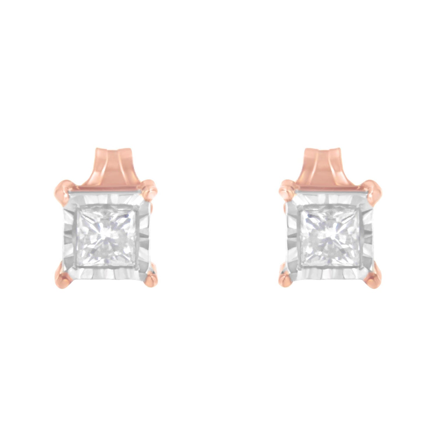 These 14K Rose Gold Plated Two-Tone .925 Sterling Silver 1/2 Cttw Princess-Cut Square Near Colorless Diamond Solitaire Miracle-Plate Stud Earrings by Haus of Brilliance feature princess-cut diamonds in a miracle plate setting, giving the illusion of larger stones. Perfect for any occasion.