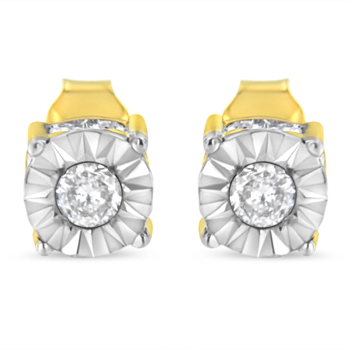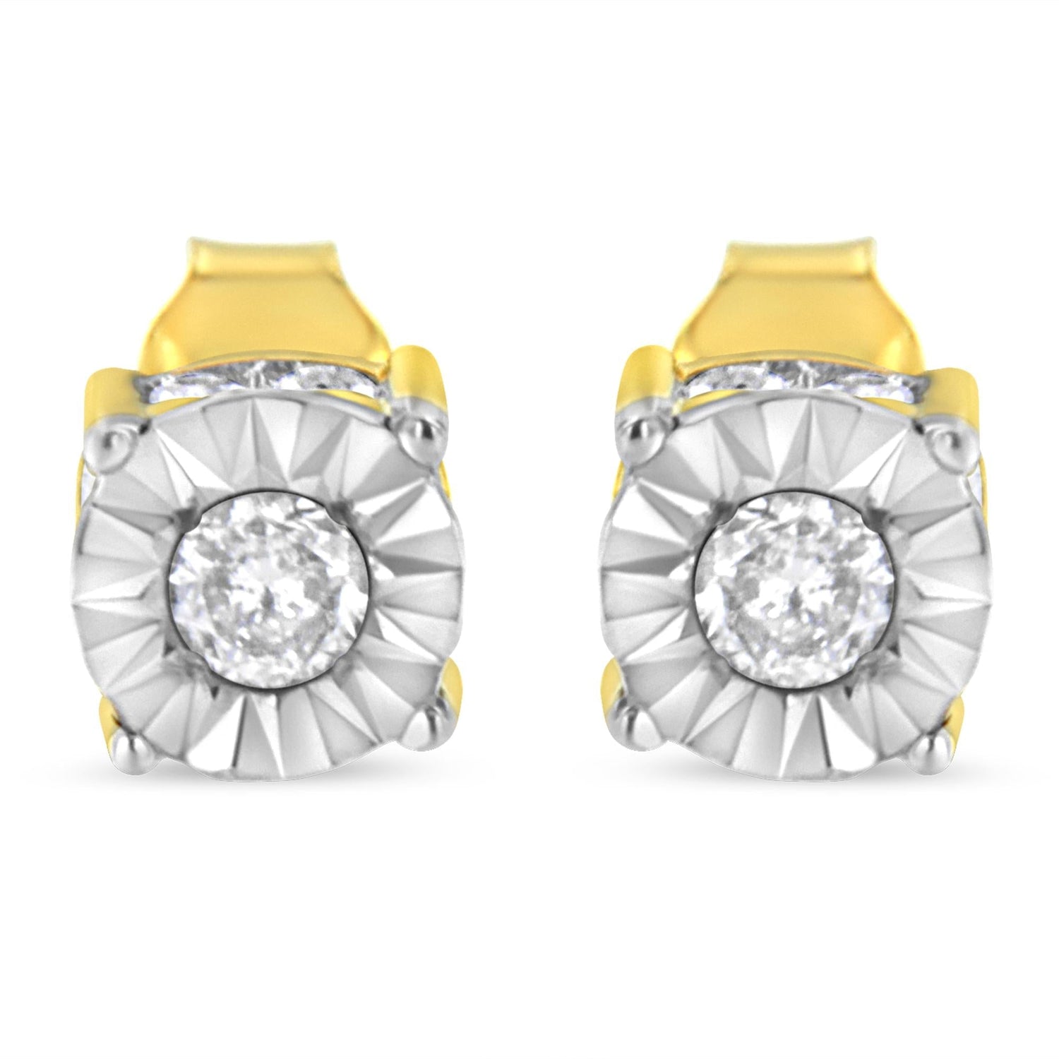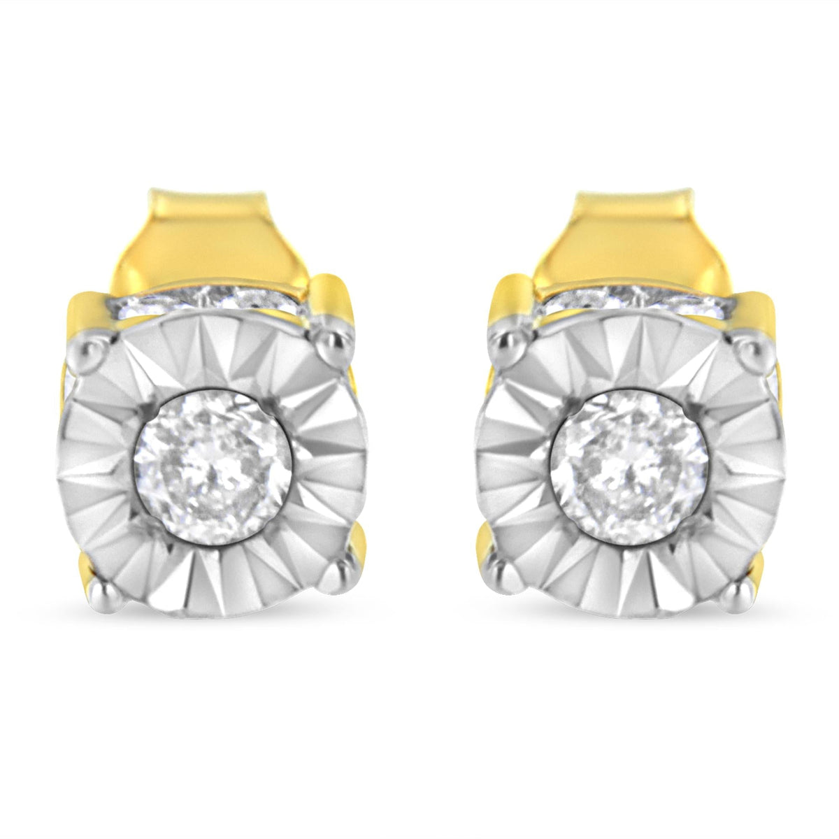 These 10K Yellow Gold Plated Sterling Silver 1/2 Cttw Miracle Set Diamond Stud Earrings by Haus of Brilliance are timeless and elegant. Featuring round-cut diamonds set in miracle settings, the total diamond weight is 1/2 Cttw. The yellow gold plating on the .925 sterling silver adds a luxurious touch to these stud earrings, making them perfect for both casual and formal wear. The push-back mechanism ensures a secure fit.