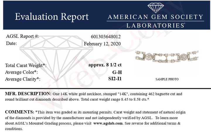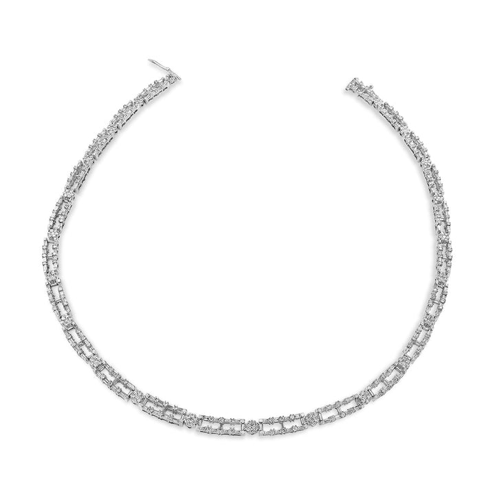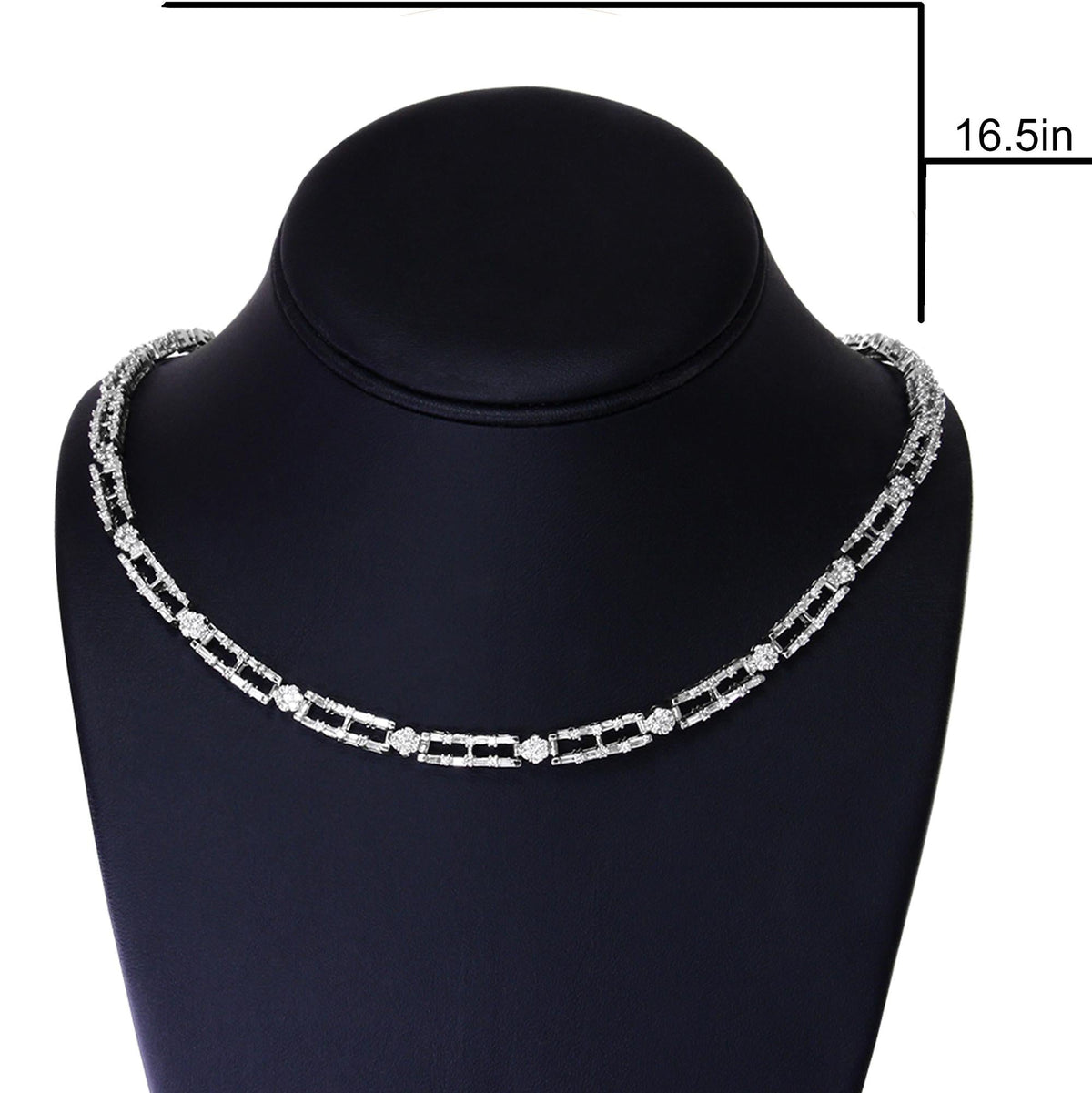 This AGS Certified 14K White Gold 8 1/2 Cttw Diamond Alternating Bar and Floral Cluster Link 18' Choker Necklace by Haus of Brilliance is an unforgettable statement piece. Crafted in cool 14K white gold, it dazzles with alternating links of diamond-encrusted floral clusters and rectangular links set with baguette and round diamonds. The 8 1/2 Cttw of diamonds catch the light beautifully, adding an unparalleled brilliance to the design. Secured with a box clasp, this choker necklace radiates confidence and allure, perfect for any significant event.