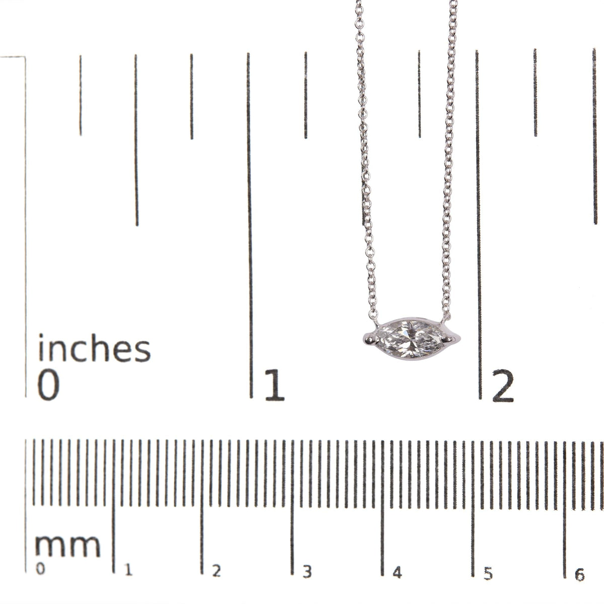 Crafted in 14K white gold with a 1/2 carat marquise-cut lab-grown diamond (F-G color, VS2-SI1 clarity). Set in east-west orientation on an 18' chain with spring ring clasp.