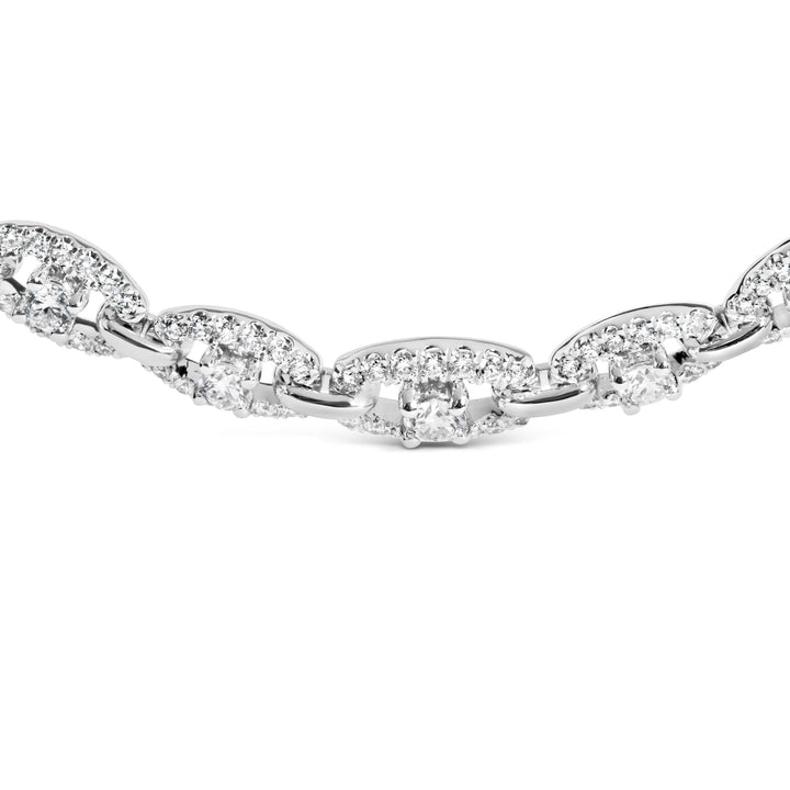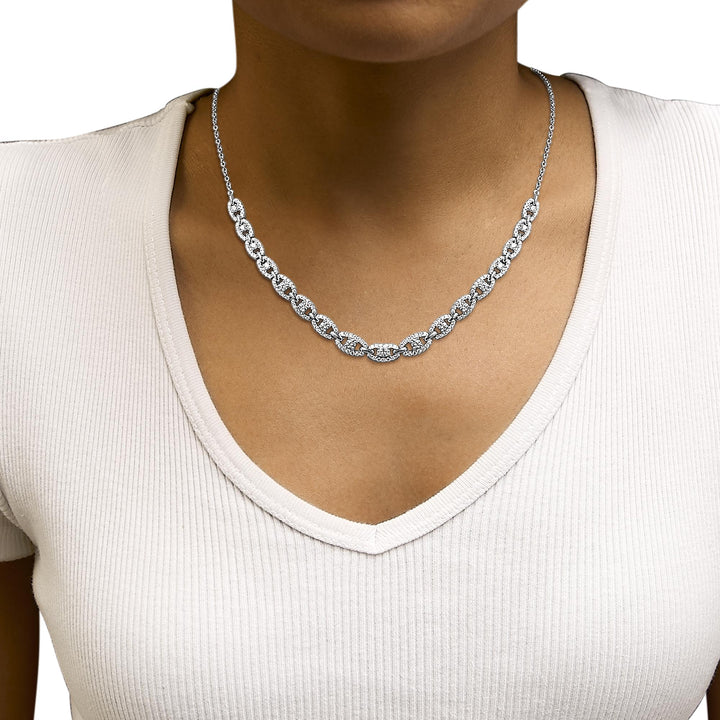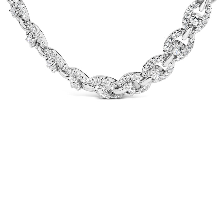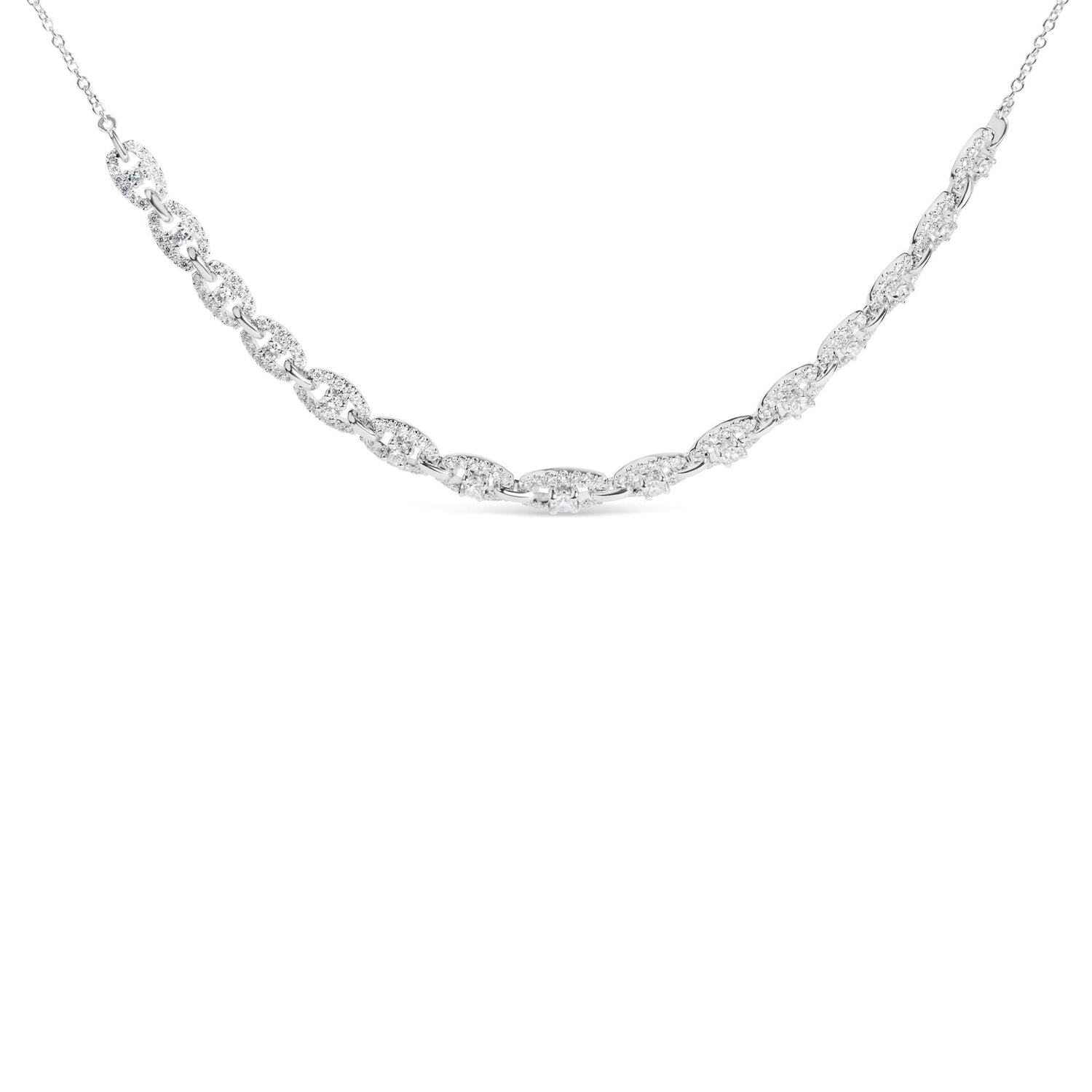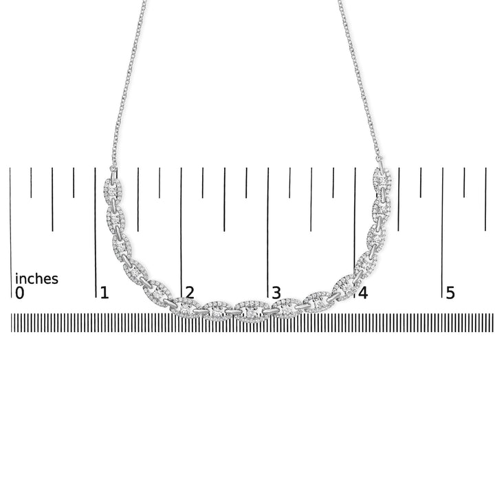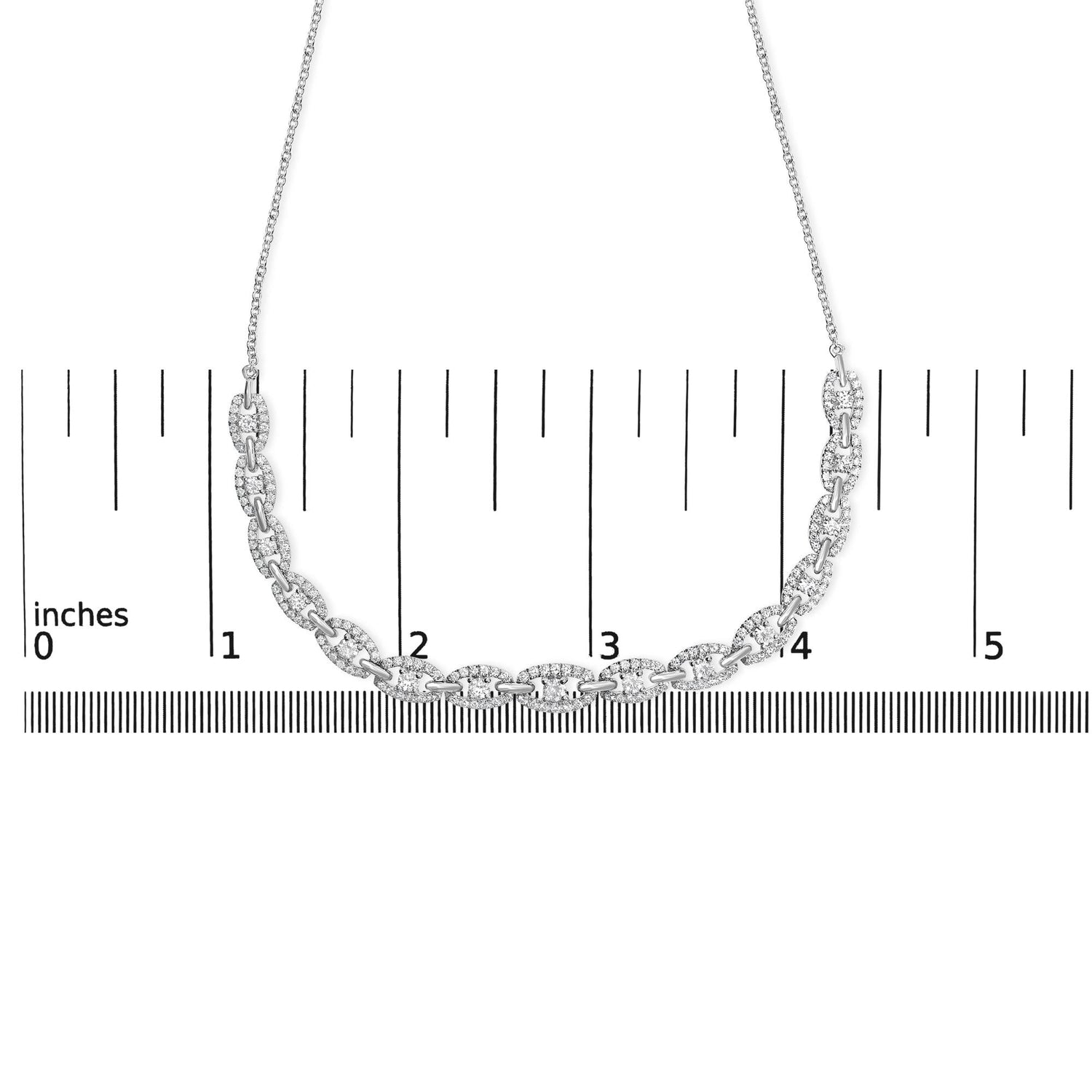 This 14K White Gold 2 1/5 Cttw Diamond Studded Interlocking Oval Link Necklace by Haus of Brilliance is a timeless piece featuring interlocking oval links adorned with 2 1/5 Cttw of diamonds. Crafted in rhodium-plated 14K white gold, this necklace is a statement of luxury and sophistication.