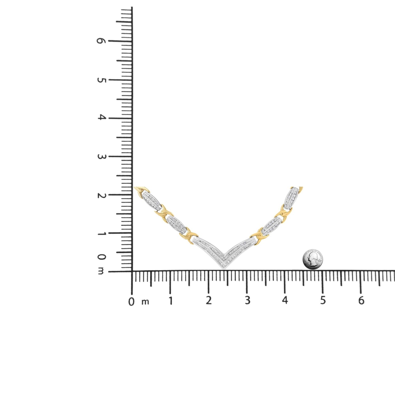 This 'V' Shape Diamond Statement Necklace by Haus of Brilliance is a study in balance and beauty. Designed with flowing lines of 10K white and yellow gold, the necklace forms an elegant V silhouette adorned with a rhythmic pattern of ‘X’ yellow gold links and segments of white gold prong-set with dazzling round-cut diamonds. A sophisticated piece that transitions effortlessly from day to night, it’s a bold yet timeless design that elevates the everyday.
