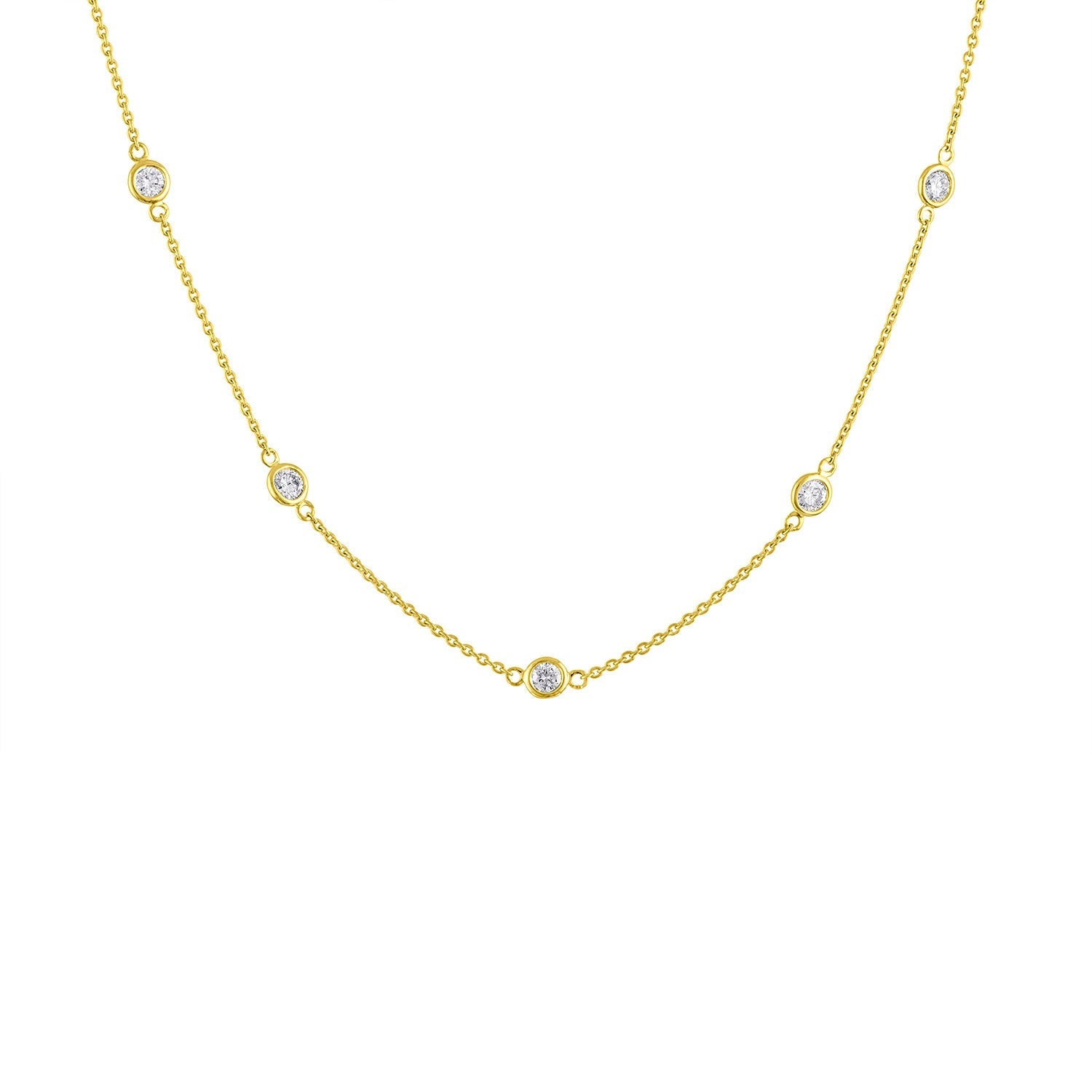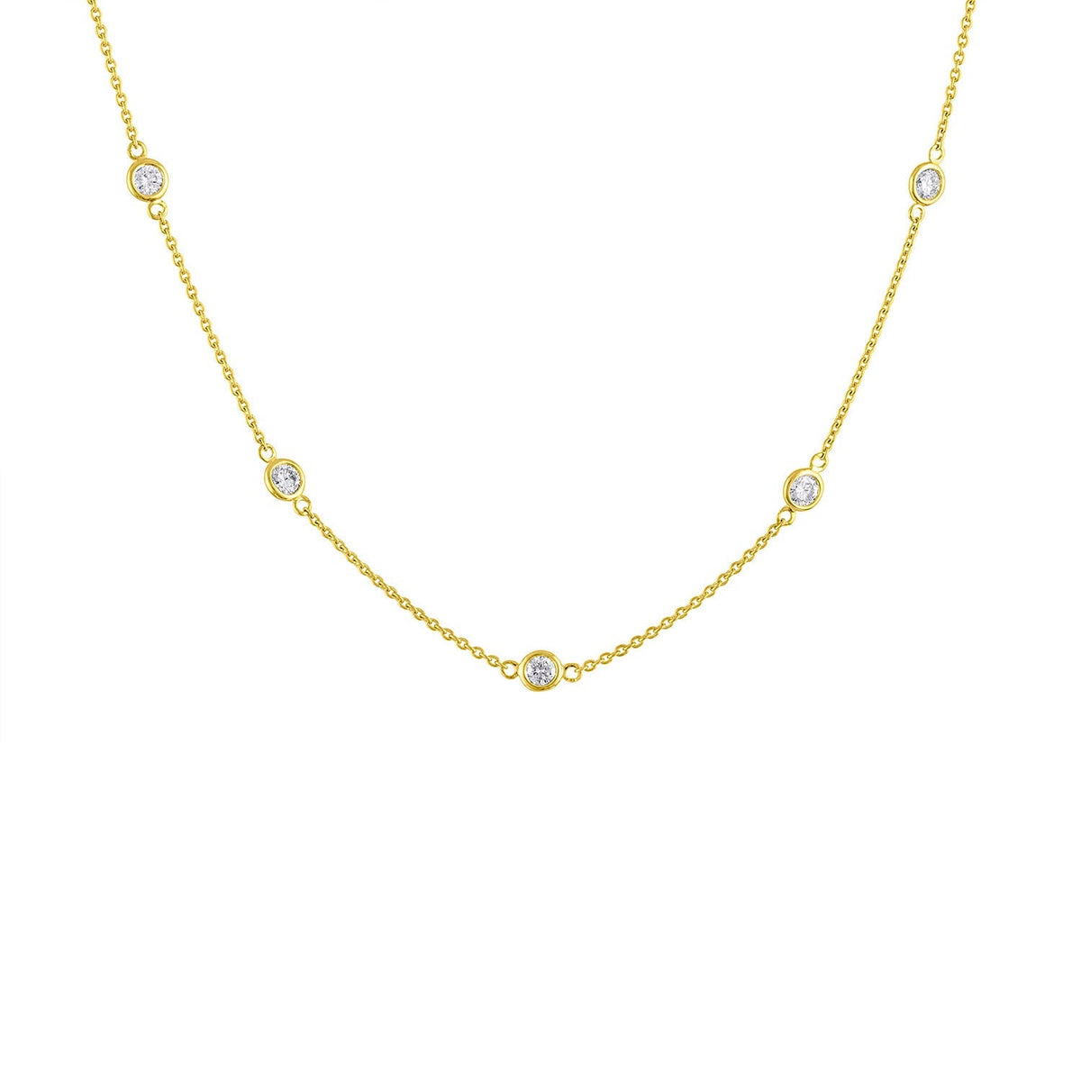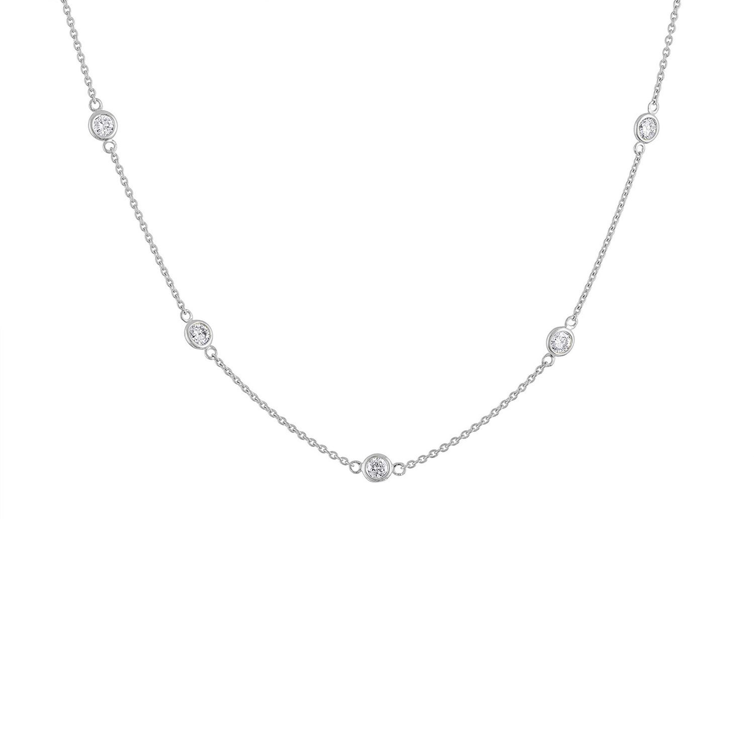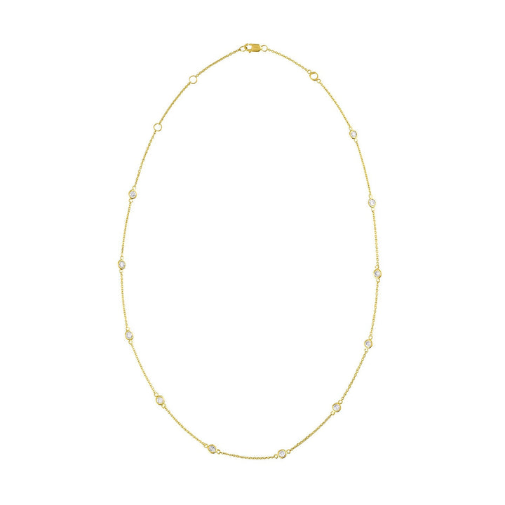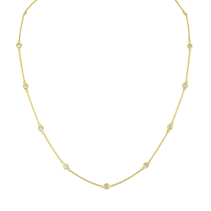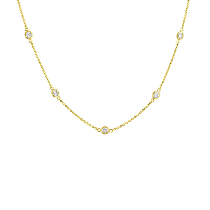 This 14K Gold Diamond Station Necklace by Haus of Brilliance is a delicate and elegant piece that features sparkling 1-carat round-cut natural diamonds, evenly spaced along a rolo chain. The bezel setting of each diamond gives this necklace a sleek, modern look, while the 14K yellow gold adds warmth and luxury. Perfect for any occasion, this piece will effortlessly elevate your style.