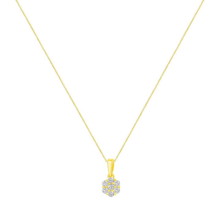 This 14K Yellow Gold 1/2 CTTW Prong Set, Round-Cut 7 Stone Diamond Flower 18' Pendant Necklace by Haus of Brilliance showcases 7 natural, round-cut diamonds set in a glistening prong setting. Crafted in warm 14K yellow gold, this pendant boasts 1/2 carat TDW of diamonds, making it the perfect accessory for any elegant evening.