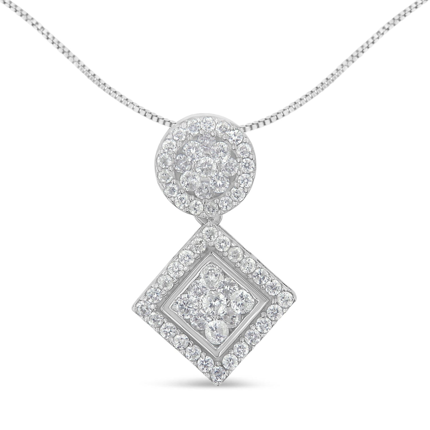 This 14K White Gold 1 CTTW Diamond Pendant Necklace by Haus of Brilliance is a striking piece featuring a geometric design. The combination of round and square clusters of diamonds adds depth and sparkle to this pendant, making it a versatile piece that can be dressed up or down. Crafted in 14K white gold, it is perfect for any occasion.