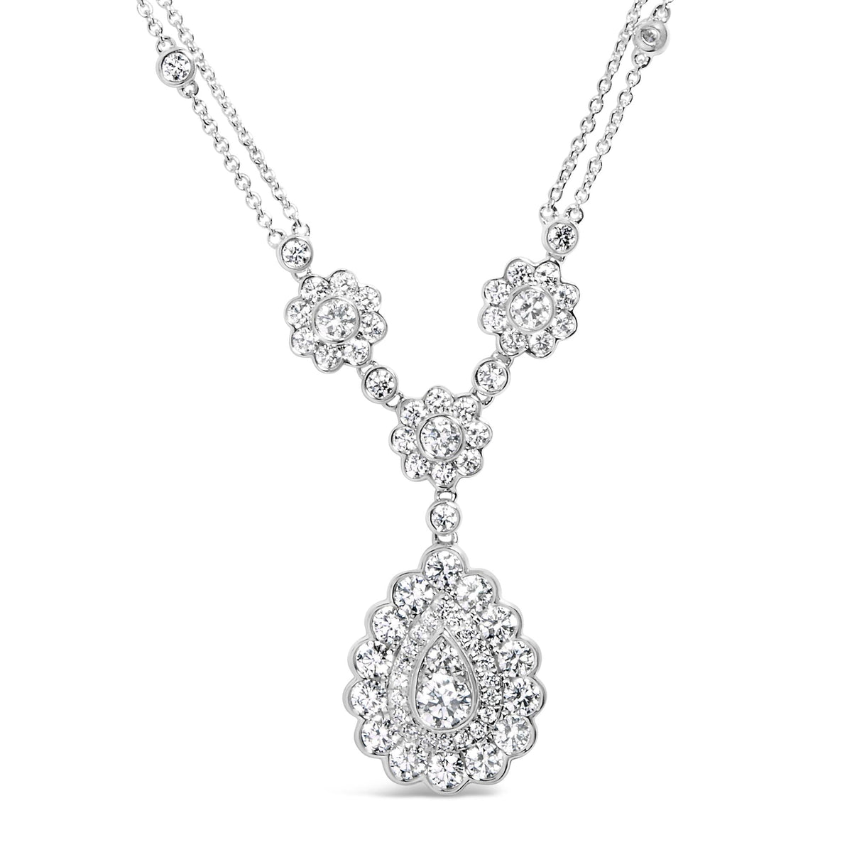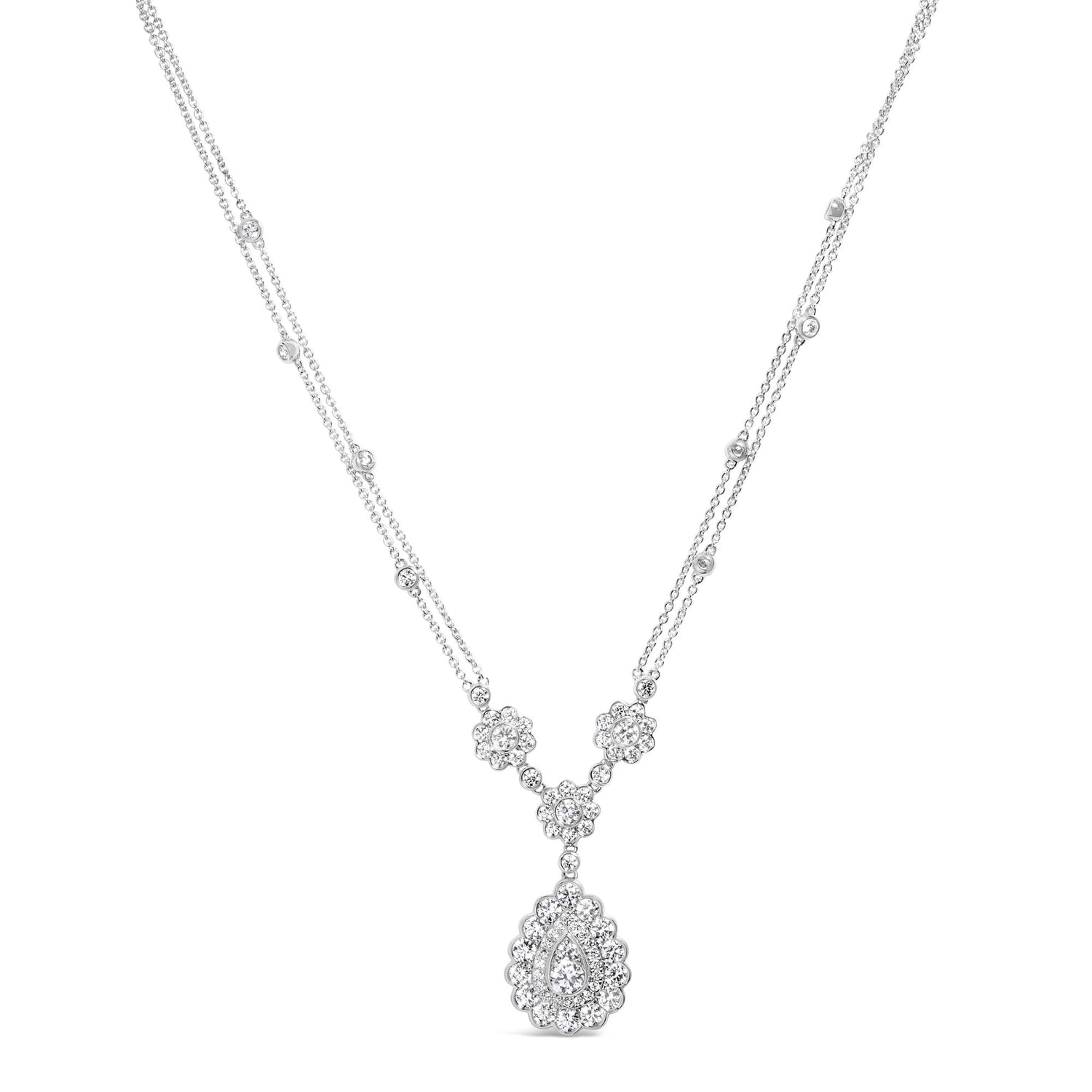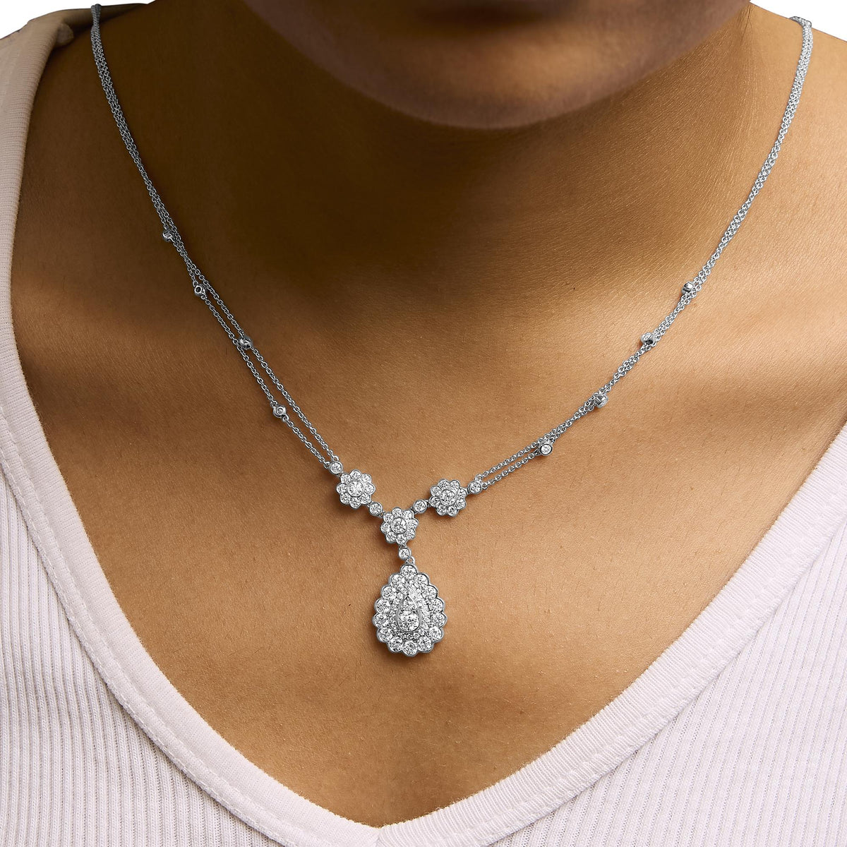 Handcrafted in 14K white gold with 2 1/2 Cttw diamonds (H-I color, VS2-SI1 clarity). Necklace measures 18' with a double cable chain and is secured with a lobster claw clasp.
