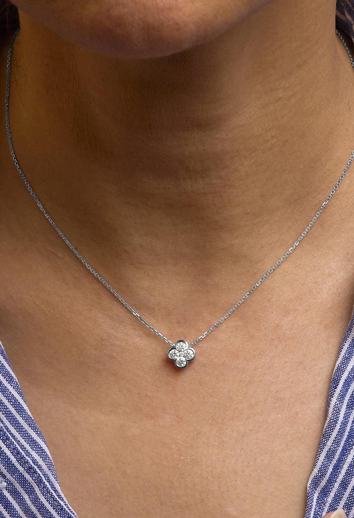 The 14K White Gold 1/2 Cttw Diamond Bezel 4 Point Floral Bloom Pendant Necklace by Haus of Brilliance is a symbol of nature’s beauty, crafted with precision in 14K white gold and rhodium plating. Featuring four bezel-set diamonds surrounding a central tension-prong-set diamond, this necklace has a total of 1/2 carat of diamonds. The 18-inch cable chain adds sophistication, while the lobster claw clasp ensures security and comfort.