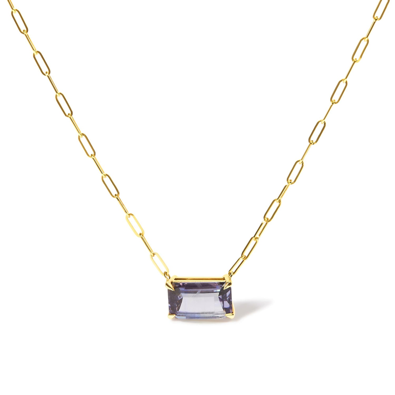 This 14K Yellow Gold Natural 2 7/8 Cttw Pixel Cut Emerald Bicolor Tanzanite Pendant Necklace by Haus of Brilliance is an exquisite blend of nature’s beauty and craftsmanship. The 2 7/8 carat bicolor tanzanite gemstone, with its unique pixel cut, captures light with its radiant purple glow. Set in luxurious 14K yellow gold, this pendant necklace is suspended from an 18-inch paperclip chain, secured with a lobster claw clasp. Ideal for those who appreciate fine gemstones and elegant design, this necklace promises to be a cherished piece for any jewelry collection.