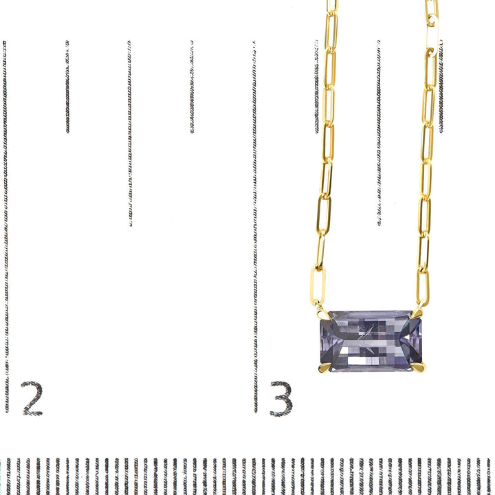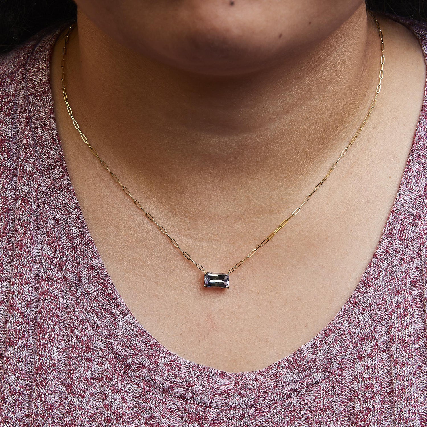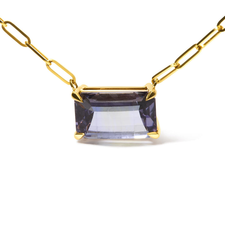 Crafted in 14K yellow gold with 2 7/8 carats of natural bicolor tanzanite. Pixel cut, 10x6mm size. 18-inch paperclip chain with lobster claw clasp.