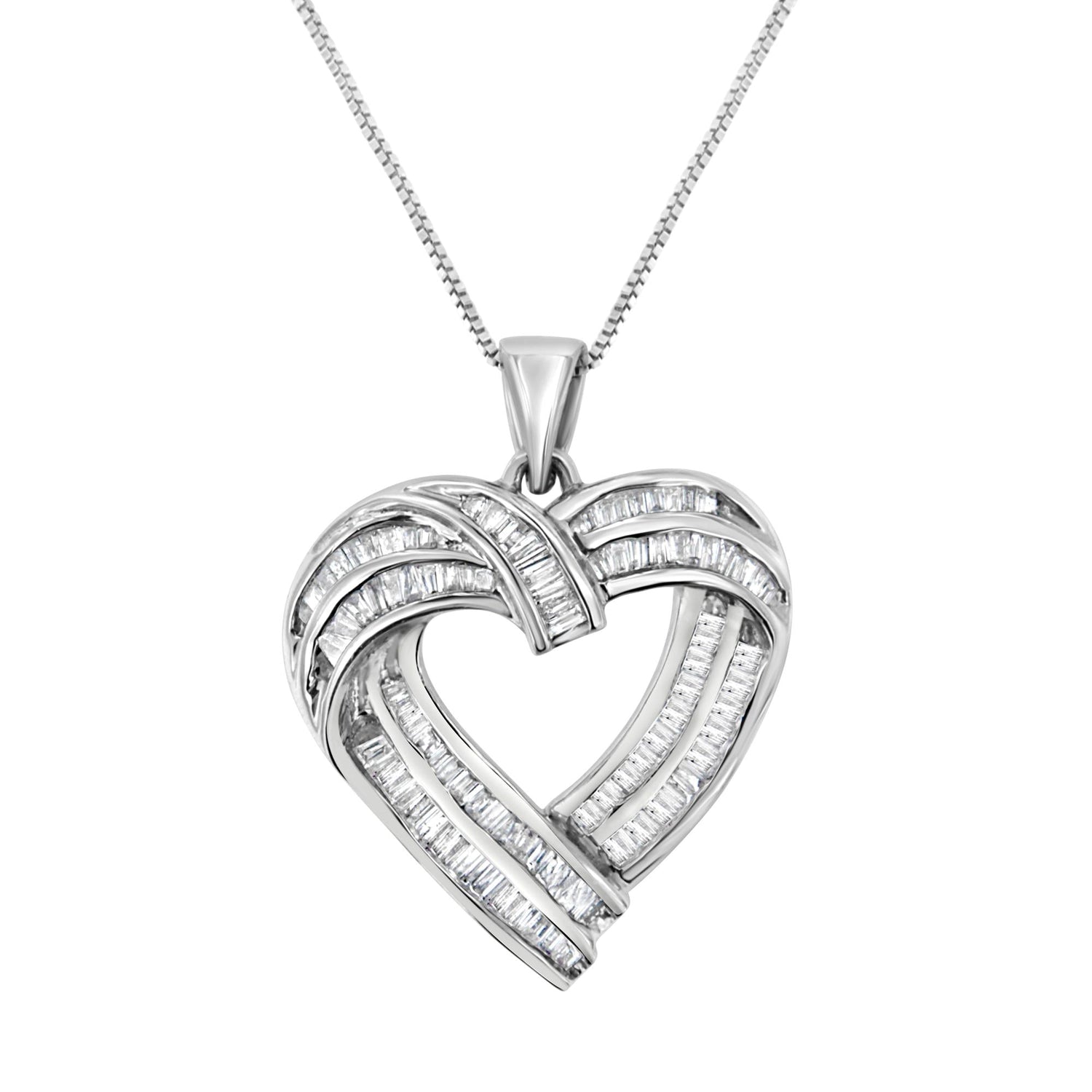 This Sterling Silver 7/8 cttw Baguette Diamond Heart Pendant Necklace by Haus of Brilliance features an interlocking heart design adorned with channel-set baguette diamonds. This delicate yet bold design conveys love and elegance, making it an ideal accessory for daily wear or special occasions.