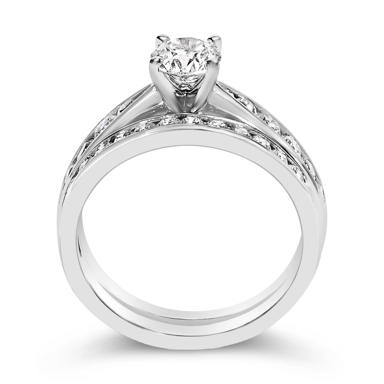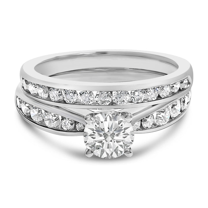 Crafted in 950 platinum with natural diamonds totaling 1 1/4 cttw (H-I color, VS2-SI1 clarity), including a 3/5 carat round center stone. Includes matching diamond wedding band.