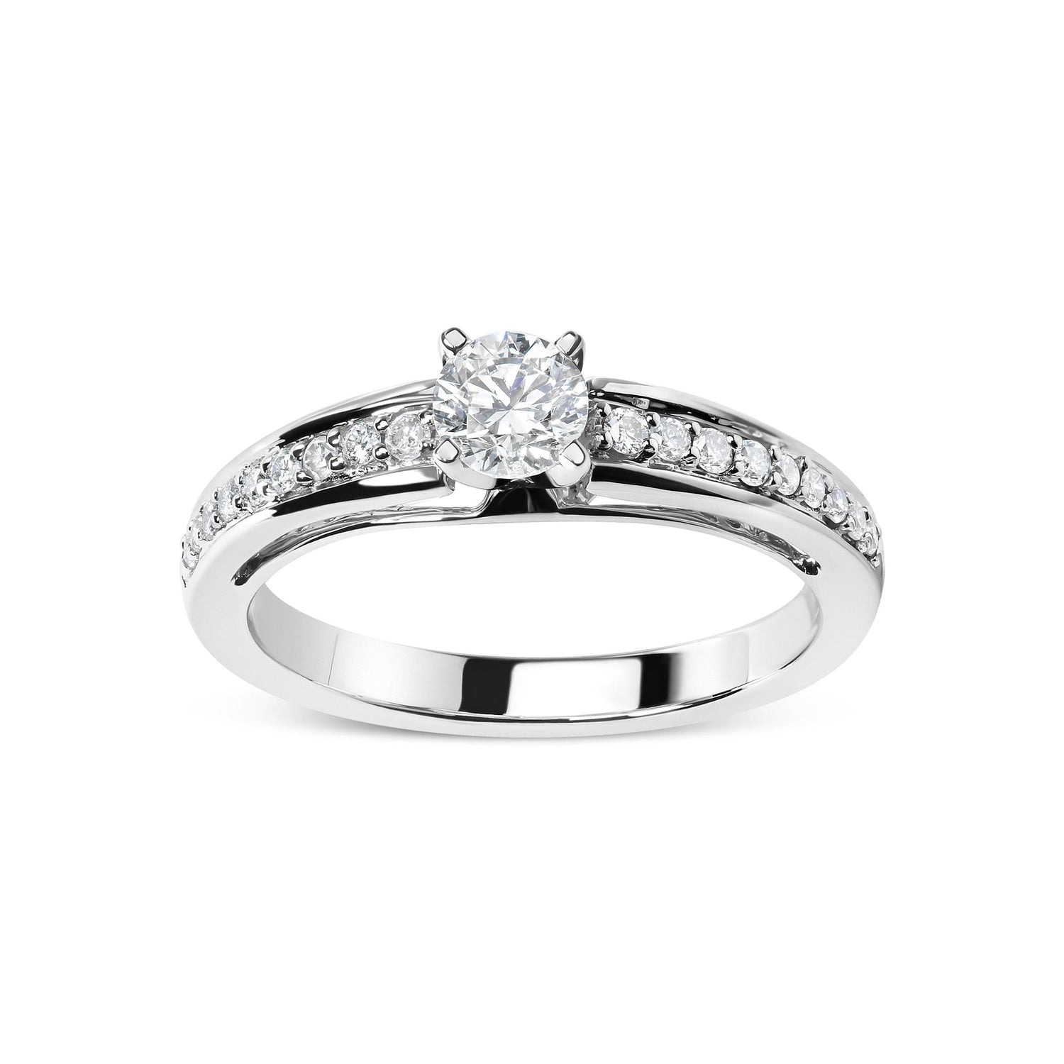This 14K White Gold 1/2 Cttw Diamond Solitaire Pave Set Engagement Ring by Haus of Brilliance is a breathtaking symbol of love. Featuring a 1/3 carat round brilliant-cut diamond in the center, surrounded by pave-set side diamonds, it shines with elegance and romance.