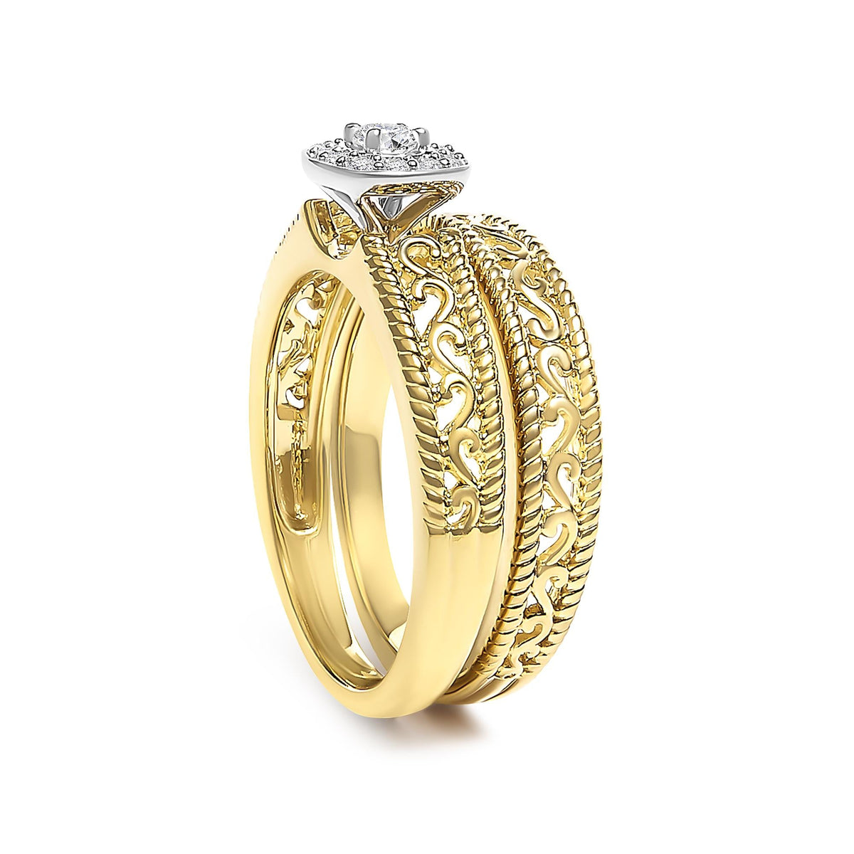 This 14K Yellow Gold Plated .925 Sterling Silver 1/5 Cttw Diamond Halo and Milgrain Finish Engagement Ring Bridal Set by Haus of Brilliance is the epitome of timeless elegance. The engagement ring features a 1/10 carat natural diamond surrounded by a halo of delicate diamonds totaling 1/5 carat. The I-J color diamonds with I3 clarity are set in radiant 14K yellow gold plating over .925 sterling silver. The ring is adorned with intricate scrollwork and milgrain finishing, while the matching band completes the set with twisted rope edges. This set is a beautiful symbol of love and commitment.
