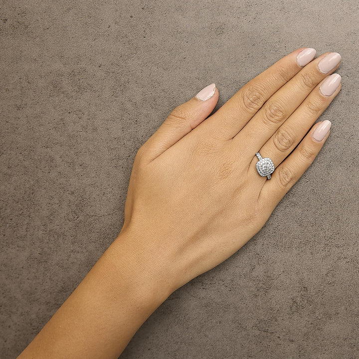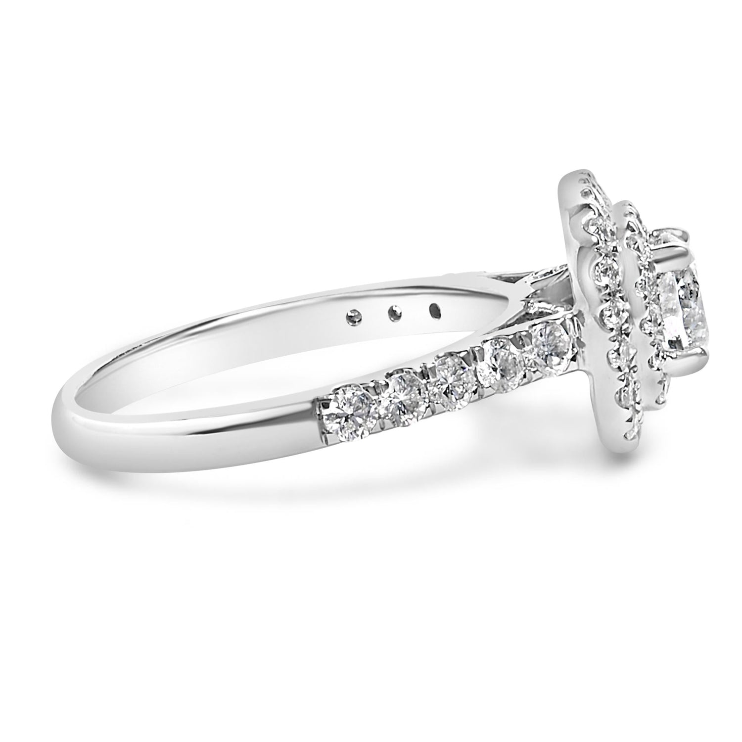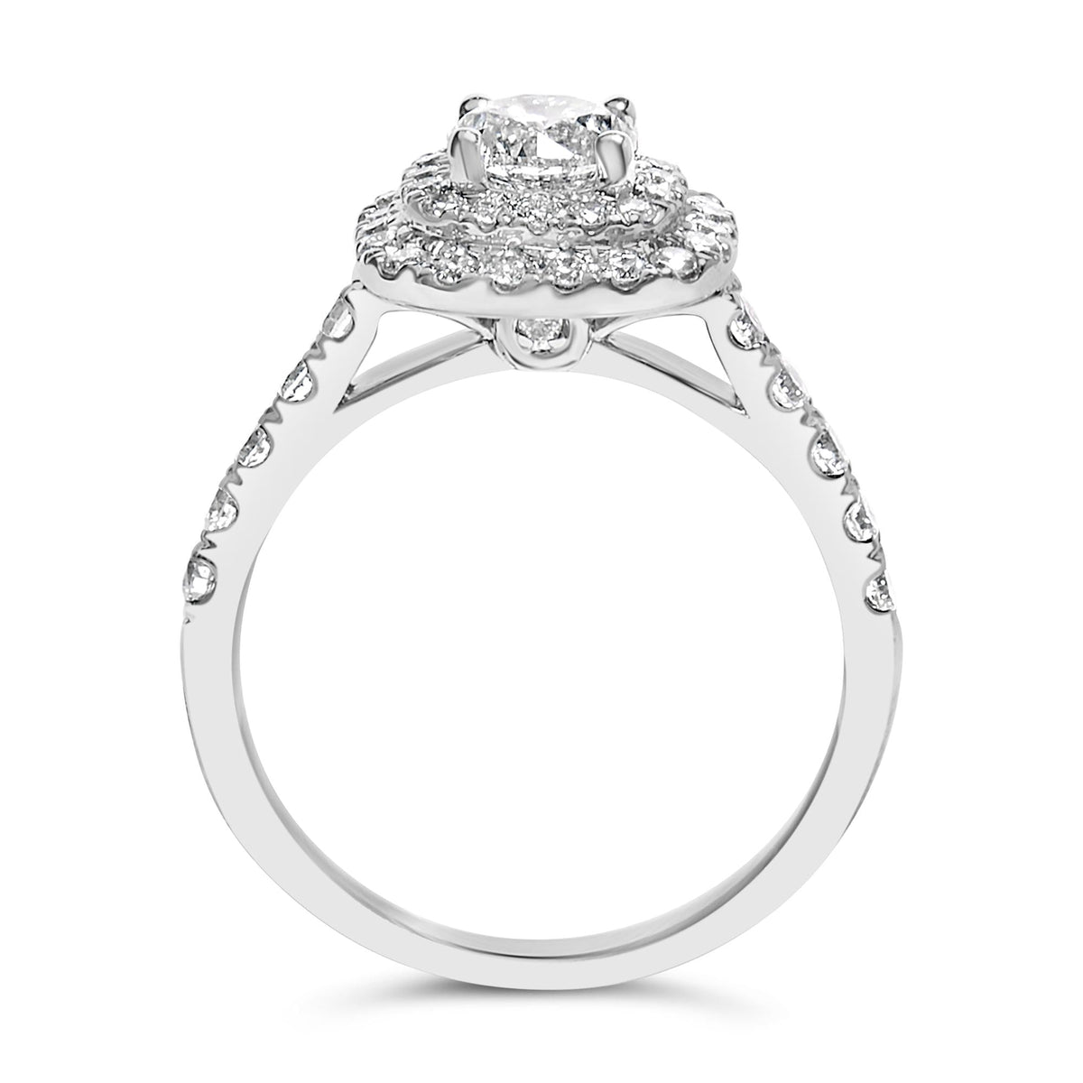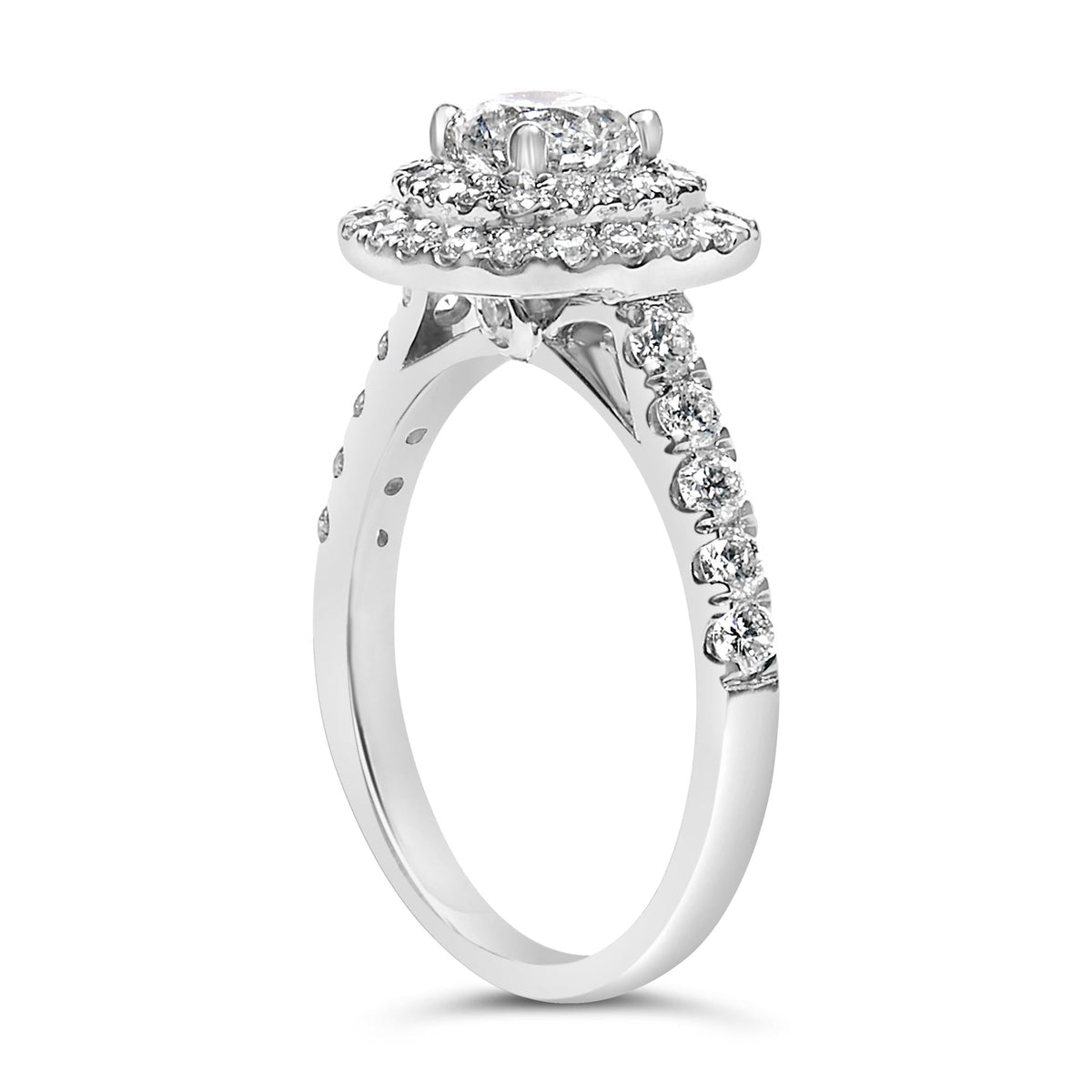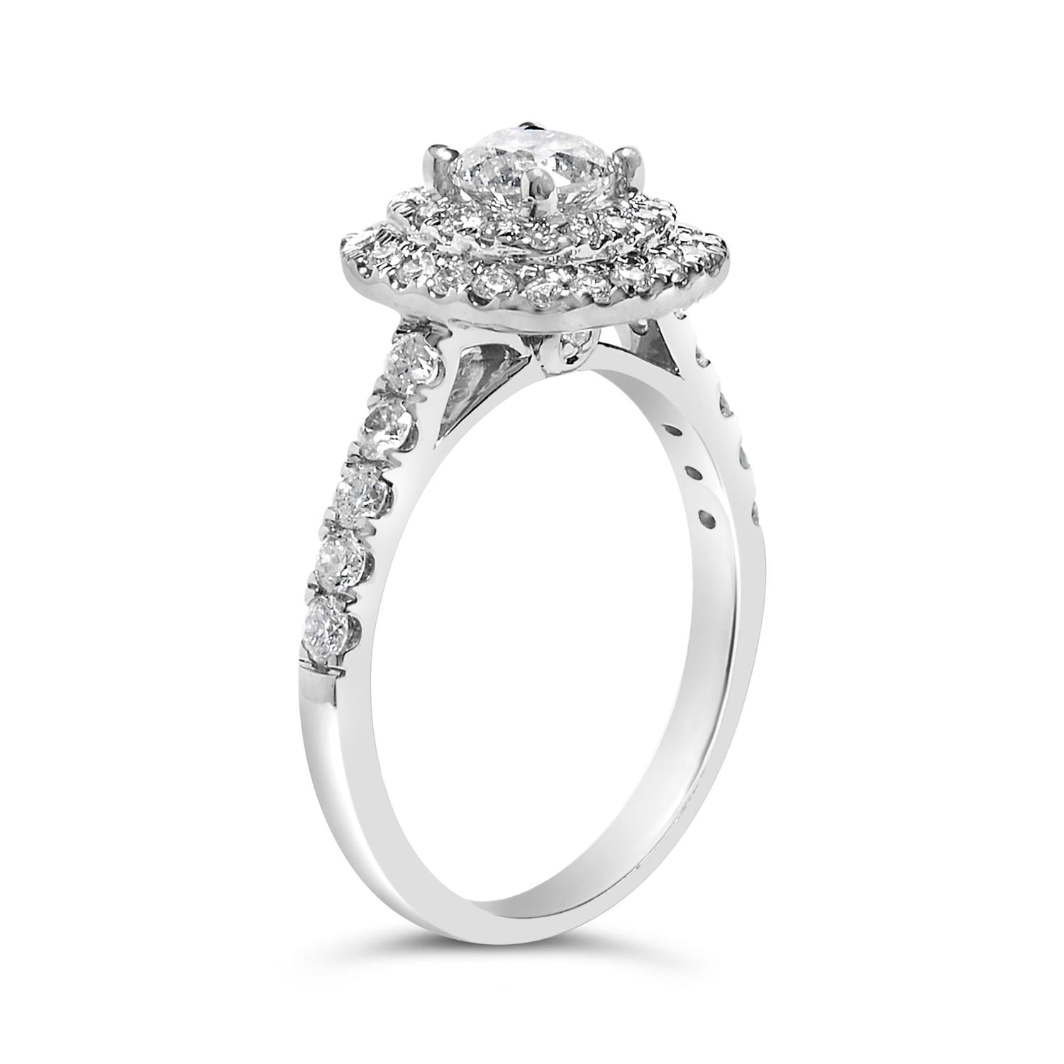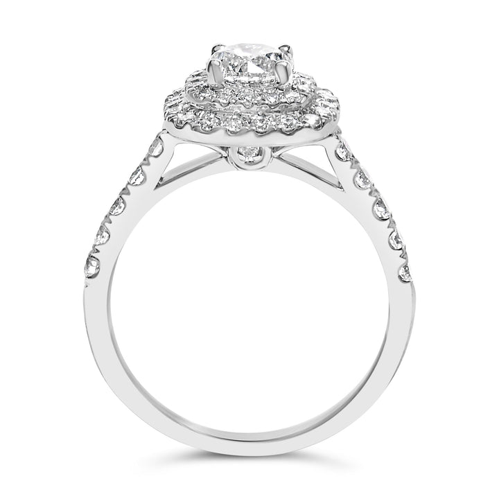 Handcrafted in 14K white gold, plated with rhodium. Featuring a 3/4-carat round brilliant-cut diamond surrounded by a double halo of smaller diamonds totaling 1 1/2 carats (H-I color, SI2-I1 clarity).