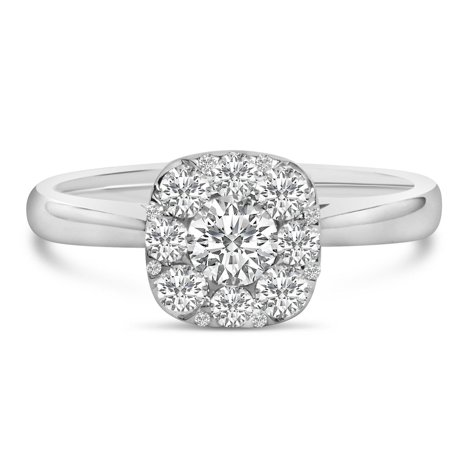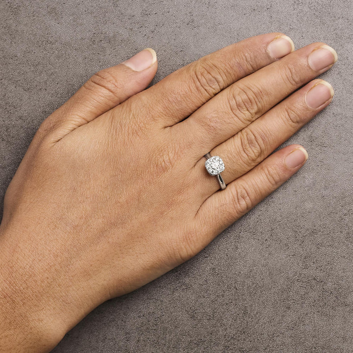 This 14K White Gold 3/4 Cttw Diamond Halo 9 Stone Bridal Engagement Ring by Haus of Brilliance is a symbol of enduring commitment. Featuring a 1/3 carat center diamond surrounded by eight round brilliant-cut diamonds, this engagement ring is designed to radiate brilliance. The ring is set in 14K white gold, bathed in a rhodium plate, ensuring lasting shine and durability. The overall design exudes timeless luxury, making it the perfect ring for that special moment.